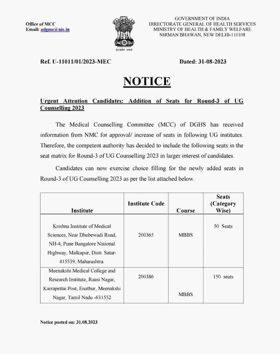 We are pleased to announce that 150 Seats have been approved and made available by the National Medical Commission for the Third Round of the Medical Counselling Committee (MCC) Counselling for admission to MBBS course, 2023-24.