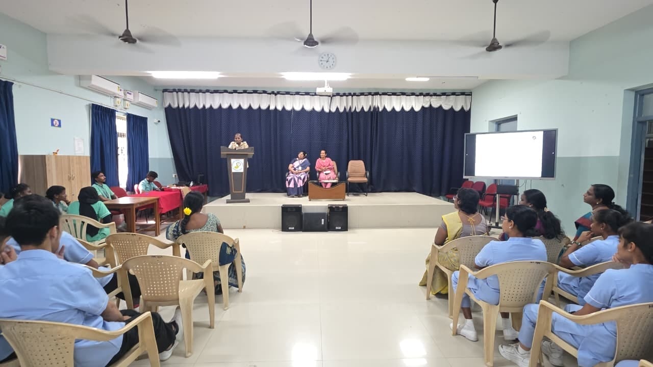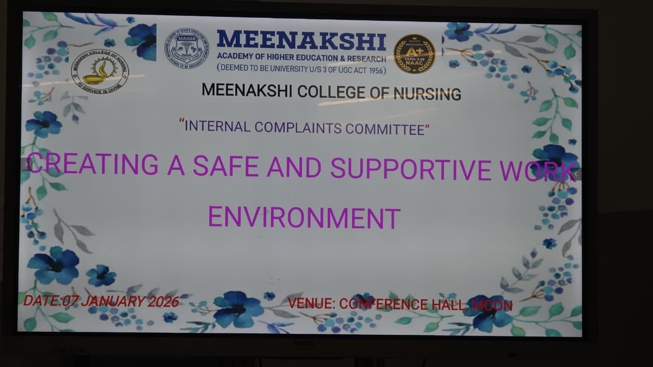 The Internal Complaints Committee (ICC) of Meenakshi College of Nursing organized an Awareness Programme on “Creating a Safe and Supportive Work Environment” on 7 January 2026, with the objective of sensitizing students and faculty on workplace safety, dignity, and the prevention of harassment. The programme began with a soulful invocation rendered by the college choir, setting a serene and respectful tone for the session. This was followed by a warm welcome address delivered by Ms. Sivasankari, B.Sc. (N) II Year, MCON.