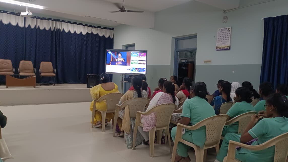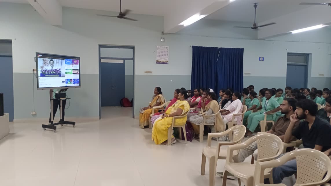 On 25th September 2025, the Tamil Nadu State Government showcased its major educational initiatives through a special live programme titled “Kalviyil Sirantha Tamil Nadu (Tamil Nadu Excelling in Education)”, held at the Nehru Indoor Stadium, Chennai from 4:00 p.m. to 8:30 p.m. The programme was telecast live at the Conference Hall of Meenakshi College of Nursing (MCON) under the supervision of Mr. Loganathan, Tahsildar, Mrs. Dolly, Revenue Inspector and Camp Incharge, Kundrathur Division, and Dr. Fabiola M. Dhanaraj, Principal, MCON.