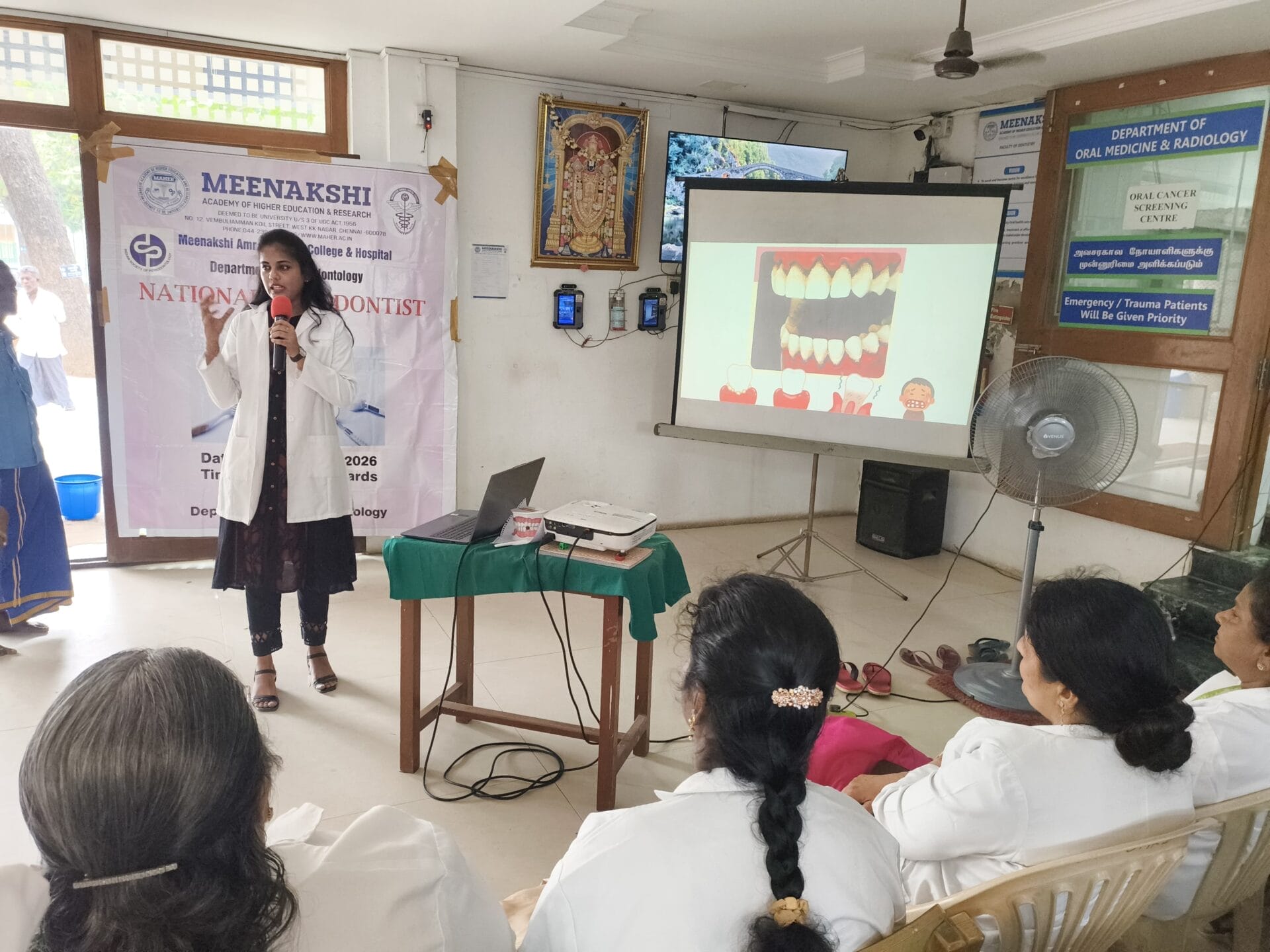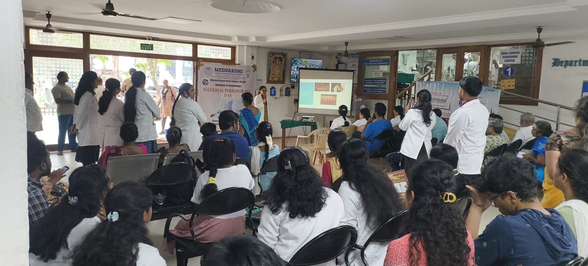 As part of the awareness outreach, a special lecture titled “Enhancing Oral Health: A Periodontist’s Perspective on Hygiene” was delivered by postgraduate students Dr. Padmaja and Dr. Aisvarya. Approximately 60 patients benefited from the informative session, which addressed key topics including the prevention and management of bleeding gums, the importance of proper brushing techniques, and strategies for maintaining optimal oral hygiene. To further strengthen preventive practices, oral hygiene kits were distributed to all 60 participants, promoting consistent daily oral care and reinforcing the message of community service.
