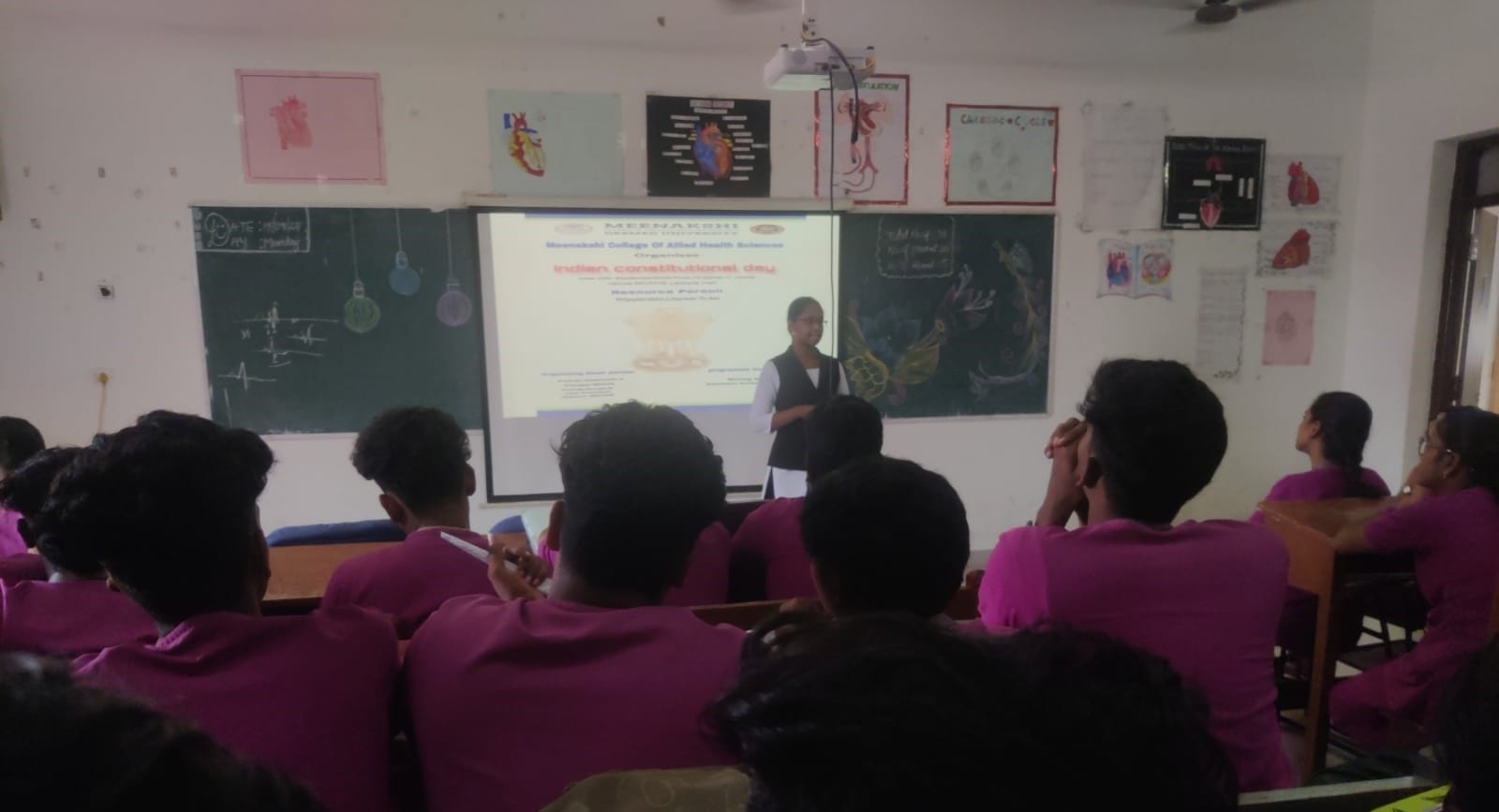 Meenakshi College of Allied Health Sciences organized “Constitution Day Celebration” with a focus on Legislative Awareness on 25th September 2025. The program was designed to deepen students’ understanding of India’s democratic framework and the vital role of citizens in upholding constitutional values.