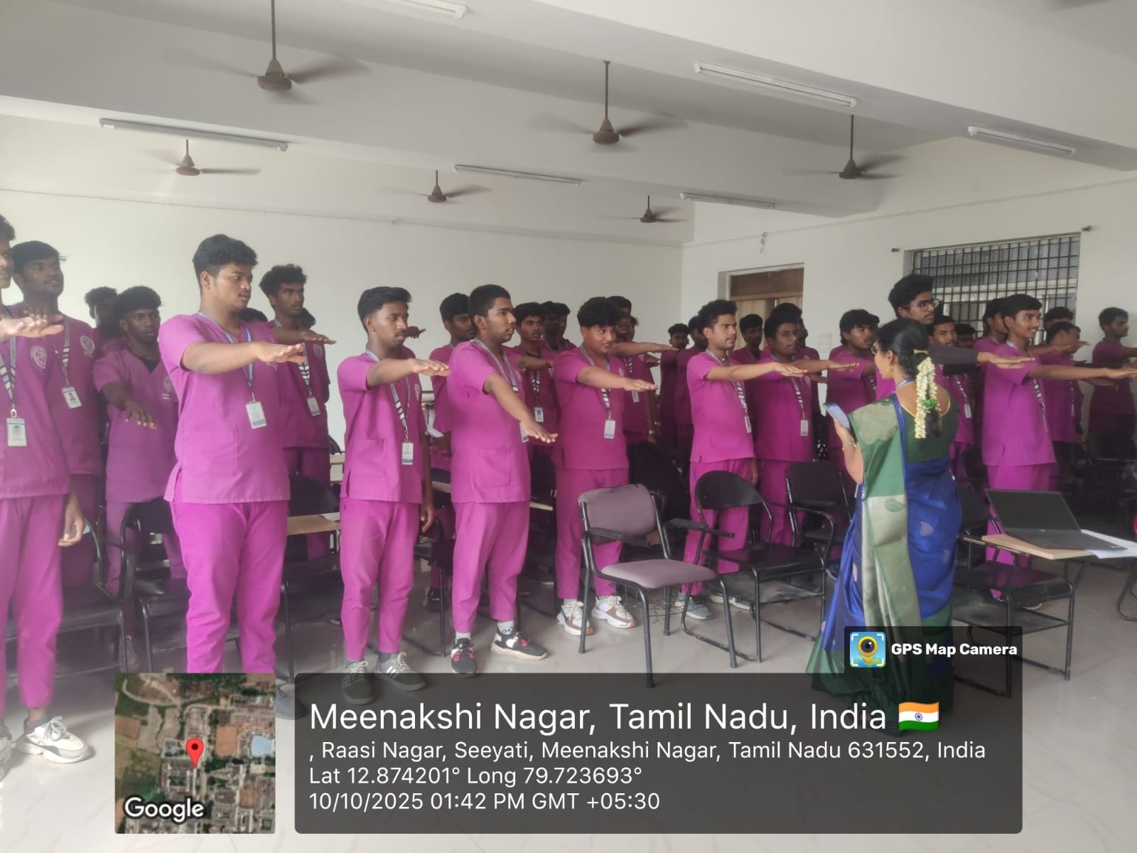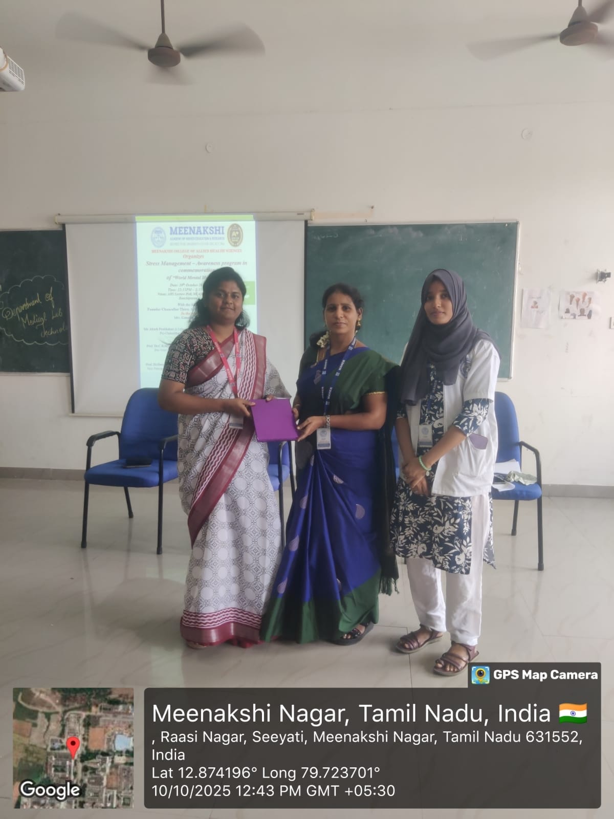 Meenakshi College of Allied Health Sciences observed World Mental Health Day on 10th October 2025 with the theme “Stress Management.” The event aimed to promote awareness about mental well-being and encourage students and faculty to adopt healthy coping mechanisms for stress in daily life.