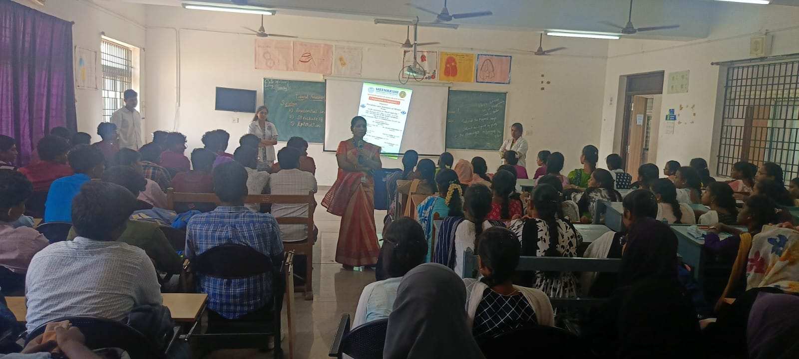 The resource person, Ms. Bhavani Priya S., Assistant Professor, Takshashila University, delivered an engaging presentation highlighting the rising prevalence of myopia, its causative factors, and preventive measures. She stressed the need for early detection, regular eye check-ups, and healthy lifestyle practices, including responsible screen time, to maintain good visual health.