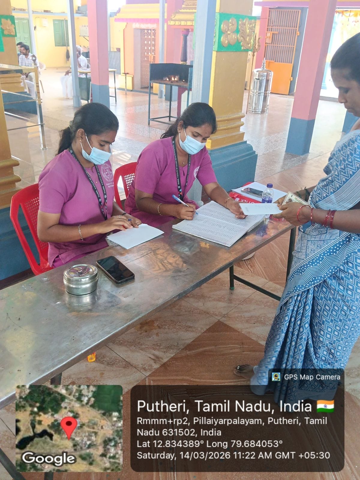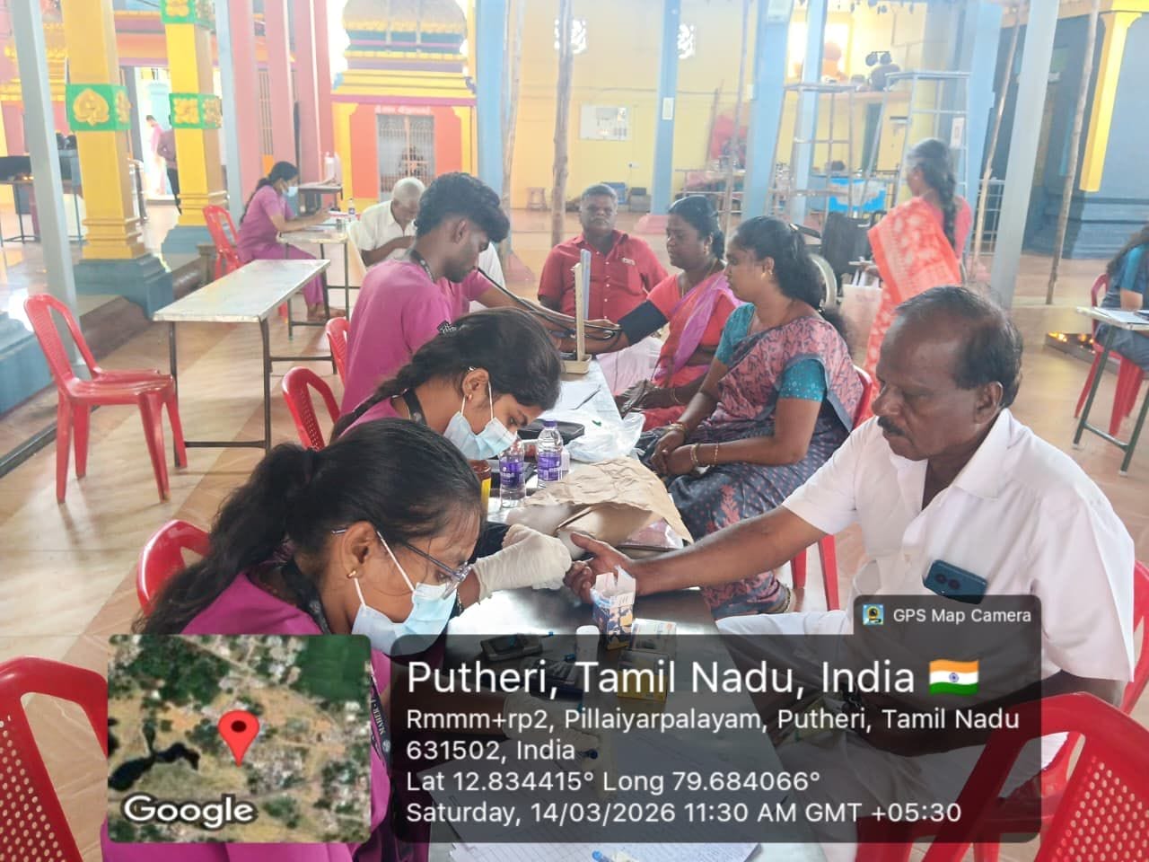 Final-year students of B.Sc. Anaesthesia Technology and B.Sc. Cardiovascular Technology from Meenakshi College of Allied Health Sciences actively participated in a medical health camp organized by Sahithya Social Welfare Trust on 14th March 2026 at Pillaiyarpalayam, Kanchipuram.