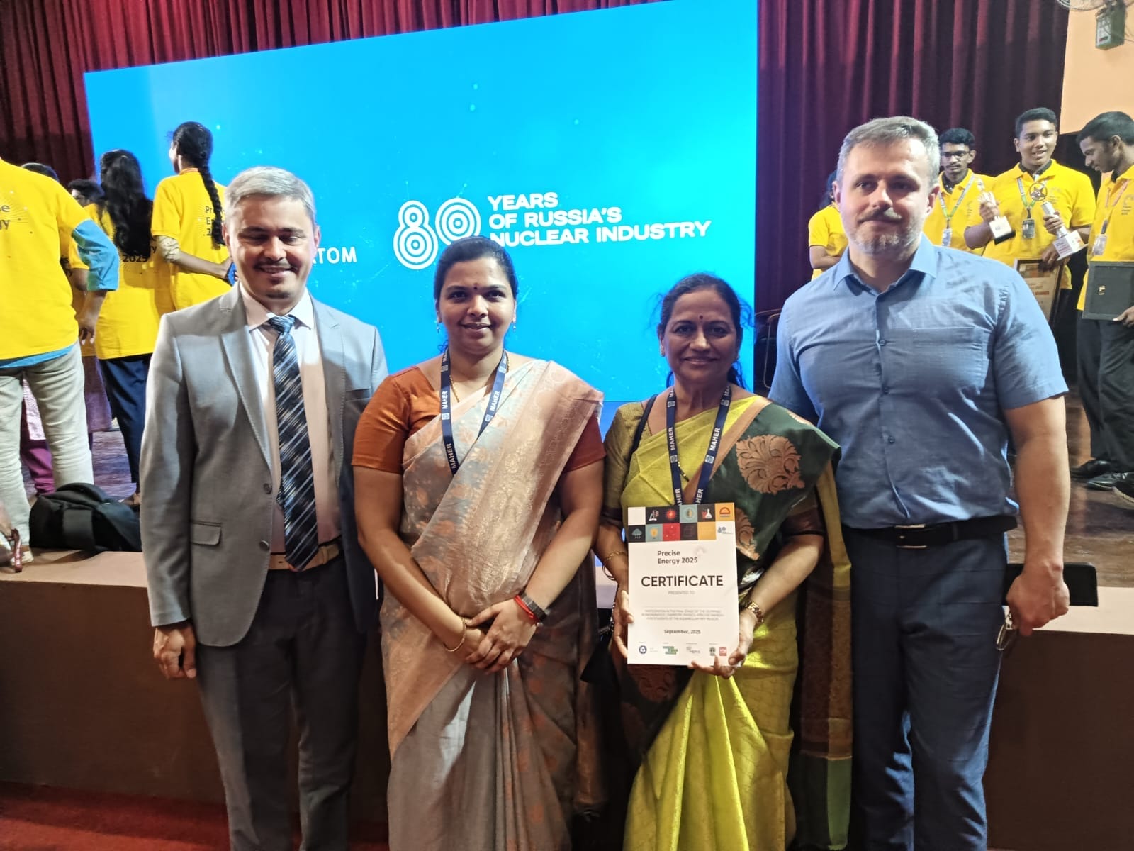 The award ceremony took place on 4th September 2025 at the Russian House, Chennai, in the esteemed presence of Mr. Alexander Dodonov, Director, Russian House, Dr. Alexander Nakhabov, Scientist, National Research Nuclear University (MEPhI), and Ms. Nina Dementsova, Head of Communications, Atomstroyexport JSC. MAHER was represented at the ceremony by Dr. N. Prabhavathi Devi, Principal (Shift II), and Dr. R. Shanthi, Head, Department of Mathematics, who congratulated the achievers and appreciated their efforts.