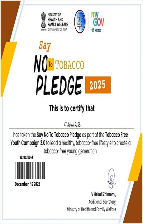 Students actively participated in the programme and, as part of the awareness initiative, took the E-Pledge through the MyGov platform and downloaded their e-certificates, reaffirming their commitment to a tobacco-free lifestyle. The programme was effectively coordinated by Dr. R. Shanthi, UGC Coordinator, MCAS, and Mrs. S. Malarvizhi, UGC Coordinator, MAHER Campus, and concluded with a positive impact and enhanced awareness among the participants, reinforcing the collective responsibility towards a healthier and tobacco-free future.