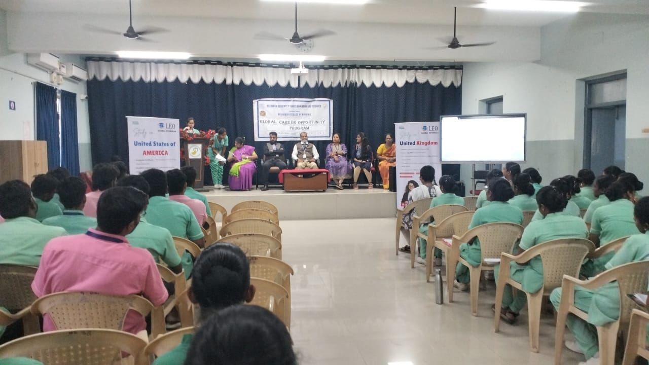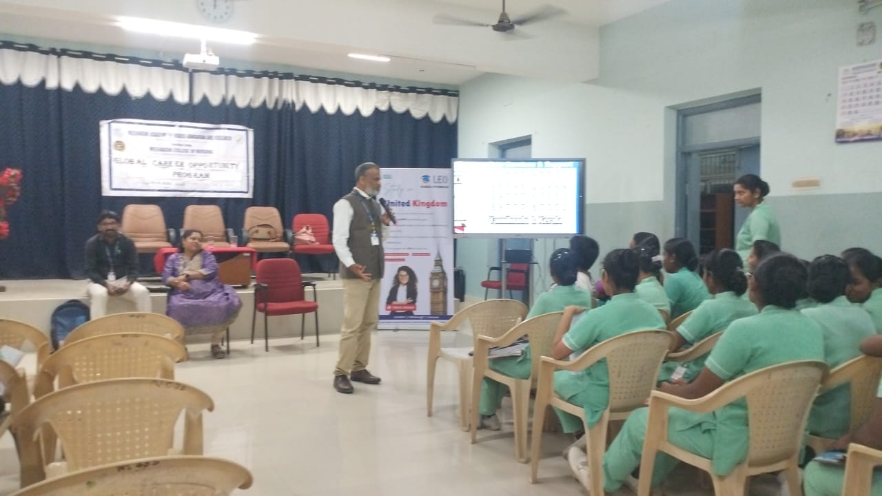 Ms. Sabeetha, B.Sc. Nursing IV Year, introduced the resource persons from Leo Global Overseas. Mr. Suresh Kumar, Operations Head, discussed the variety of job opportunities available for nurses in the UK, the processes for pursuing higher education abroad, and the provision of free IELTS training. Dr. K. Lakshminarayanan, Strategy Head, elaborated on preparation strategies, application processes, IELTS requirements, and eligibility criteria for international placements. Mr. Suriya, Technical Head, further encouraged students to begin early preparation to secure overseas opportunities with ease.