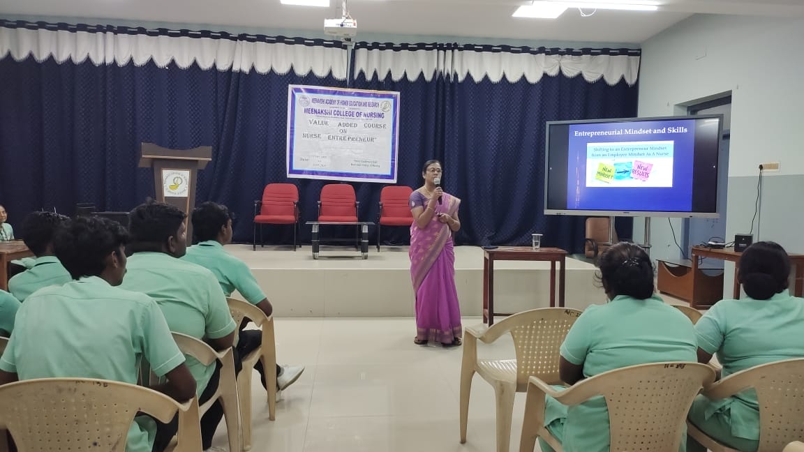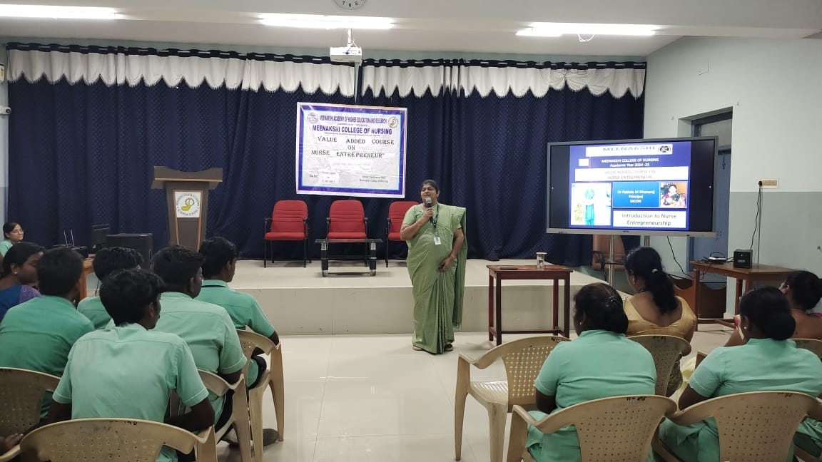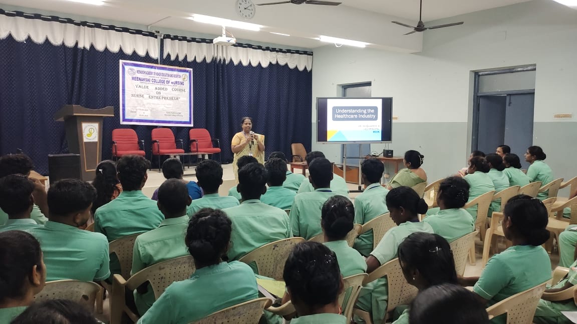 From May 19th to 23rd, 2025, Meenakshi College of Nursing, MAHER, conducted a Value Added Course titled “Nurse Entrepreneur” for final-year nursing students. The course aimed to cultivate an entrepreneurial mindset among nursing professionals and to introduce students to emerging business opportunities within the healthcare sector.