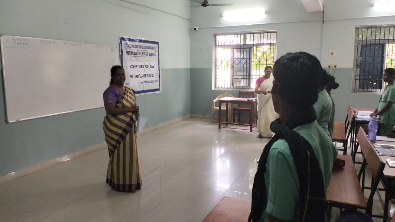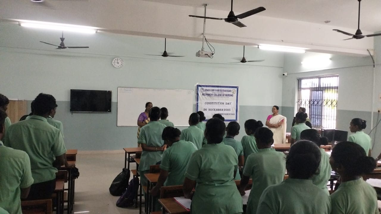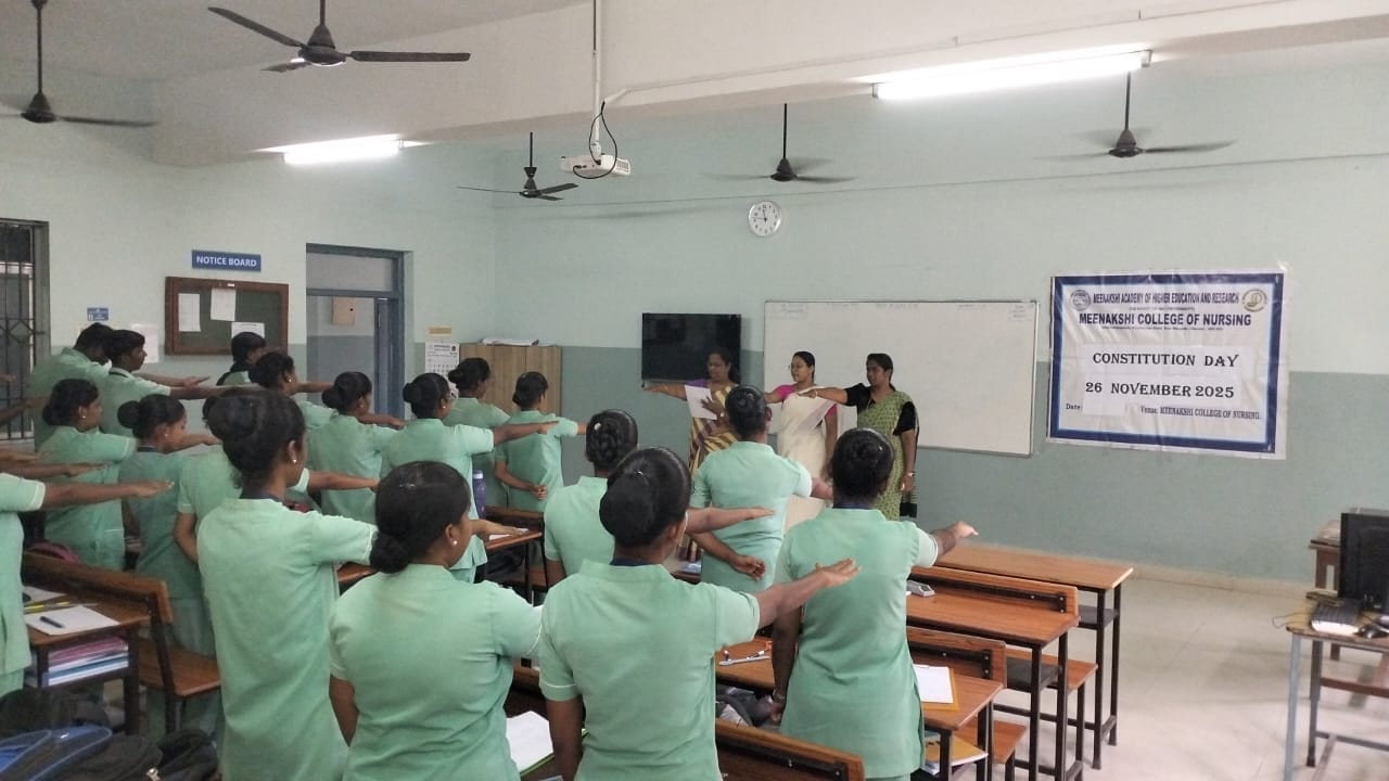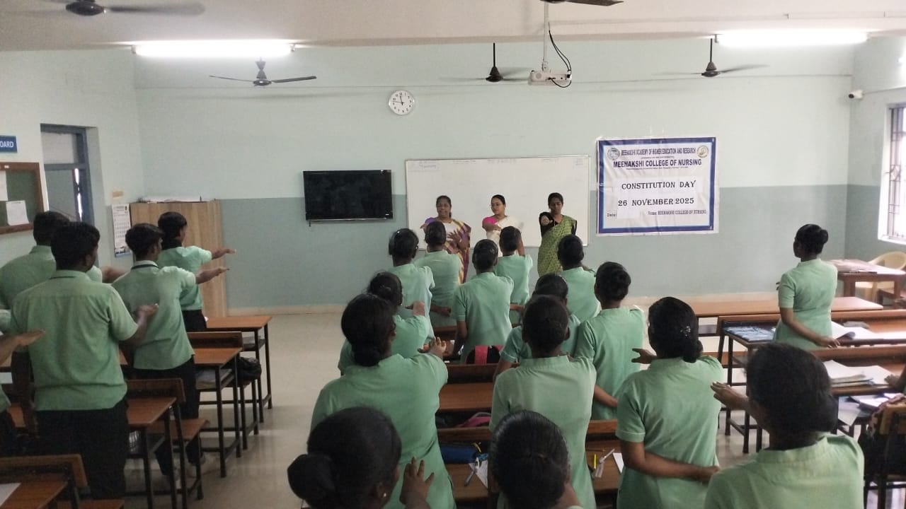 Meenakshi College of Nursing celebrated Constitution Day on 26th November 2025 with great enthusiasm and respect for the nation’s democratic values. The program was coordinated by Ms. Lalitha D., Tutor, and Ms. M. Regi Cindrella, Tutor, MCON.