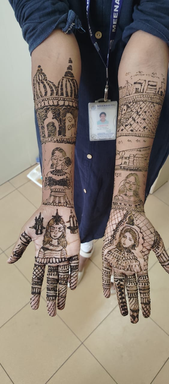 In the fine arts competitions, students impressed with their skills in pencil sketching, rangoli, poster making, and face painting. Ms. Anisha R and Ms. Sabeetha S (B.Sc. Nursing – IV Year) secured first prize in face painting, winning accolades for their creative and impactful design.