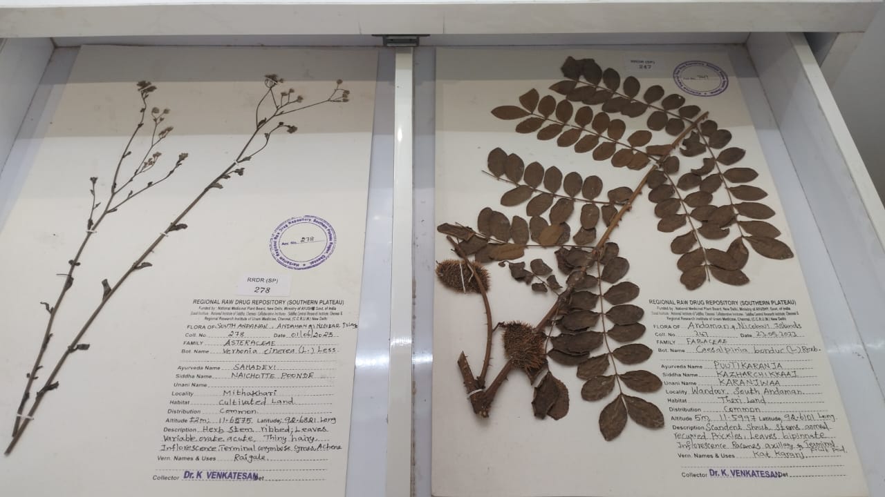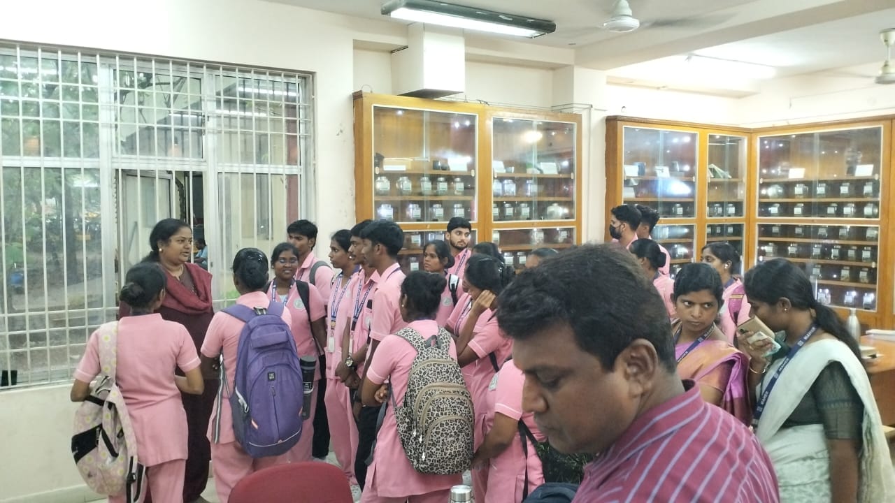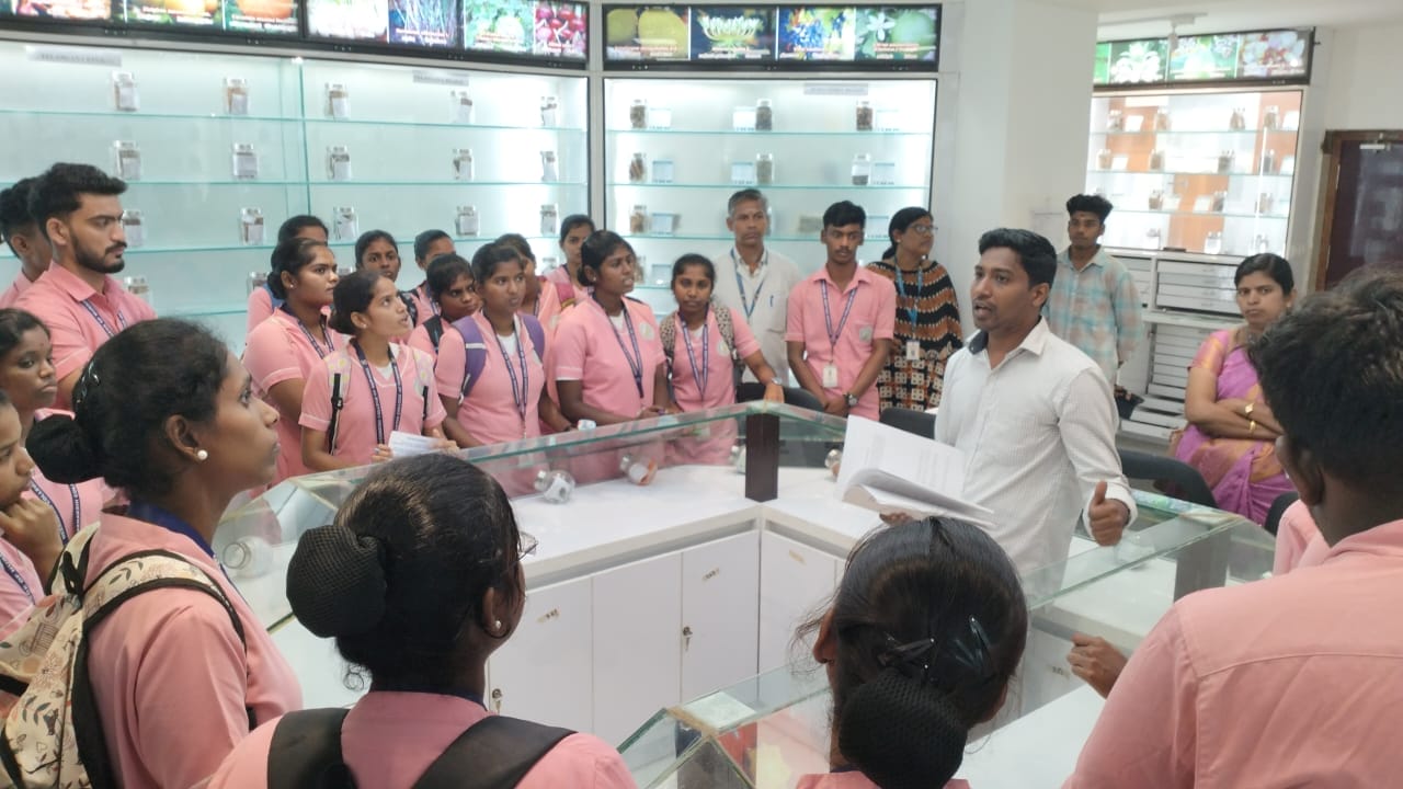 During the visit, students also explored the hospital’s laboratory facilities, including the Siddha Pharmacology Laboratory, which supports clinical services, undergraduate training and research initiatives of the Institute. A significant part of the educational tour was the visit to the Regional Raw Drug Repository (RRDR), which houses an extensive collection of raw medicinal materials—plant-based, animal-based and mineral-based—along with details of their therapeutic applications.