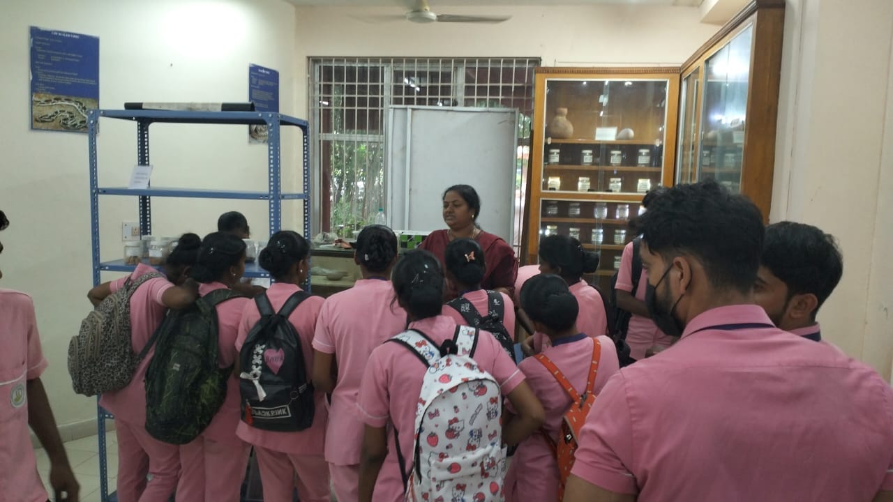 The students were particularly intrigued by innovative traditional practices such as Karanool, a medicated surgical thread presented as a natural alternative to modern allopathic suture materials. The on-campus museum showcased ancient surgical instruments, traditional grains and millets, raw drug specimens, miniature models of processing equipment and rare palm-leaf manuscripts authored by Siddhars, offering an enriching historical perspective.