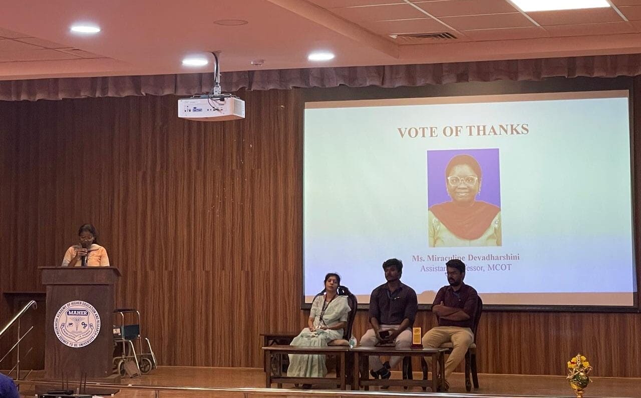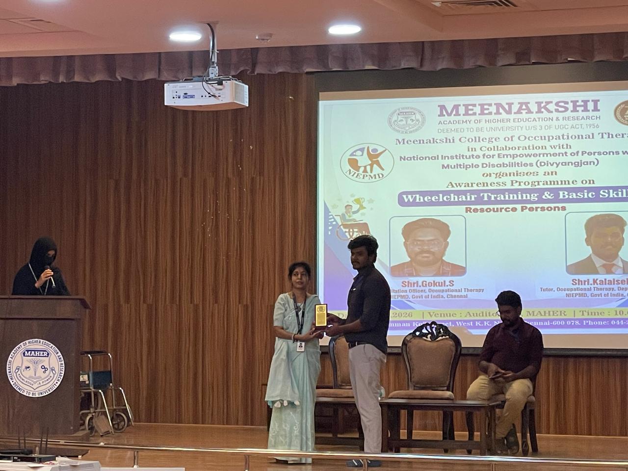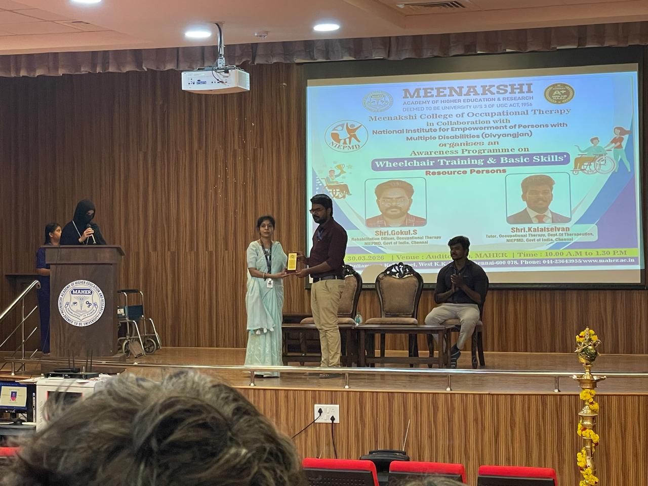Meenakshi College of Occupational Therapy, MAHER, in collaboration with the National Institute for Empowerment of Persons with Multiple Disabilities (Divyangjan), Ministry of Social Justice & Empowerment, Government of India, organized an Awareness Program on Wheelchair Training and Basic Skills on 30th March 2026 from 10:30 A.M. to 1:30 P.M. at the Auditorium, MAHER.