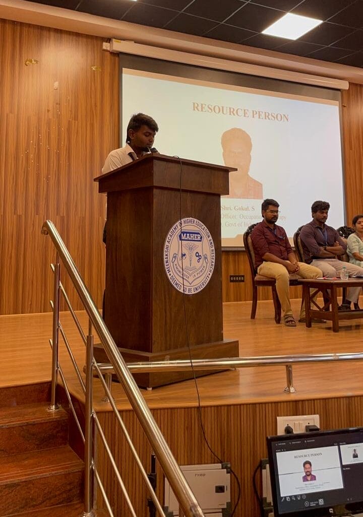 The resource persons for the programme were Shri Gokul S, Rehabilitation Officer (Occupational Therapy), NIEPMD, and Shri Kalaiselvan, Tutor, Department of Therapeutics, NIEPMD. They were introduced by Mr. Bennett Branson Benjamin, Assistant Professor, Meenakshi College of Occupational Therapy, who outlined their expertise and contributions to the field of rehabilitation.