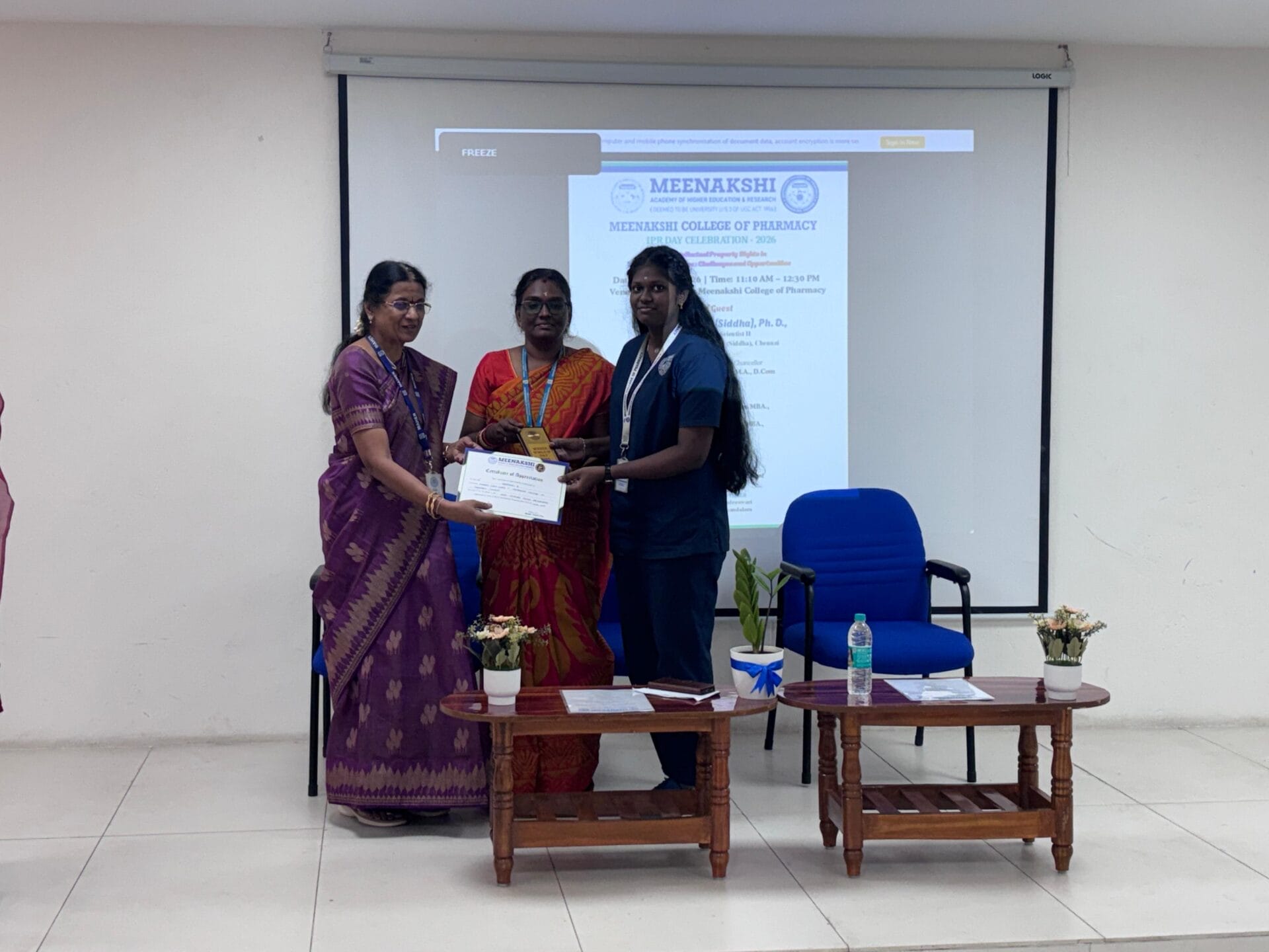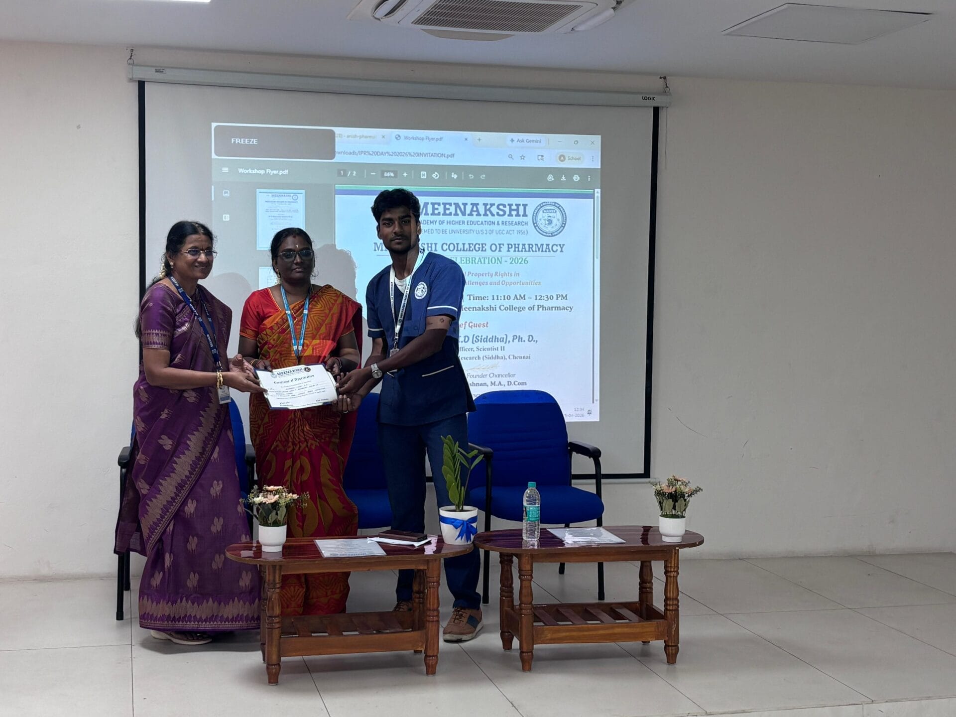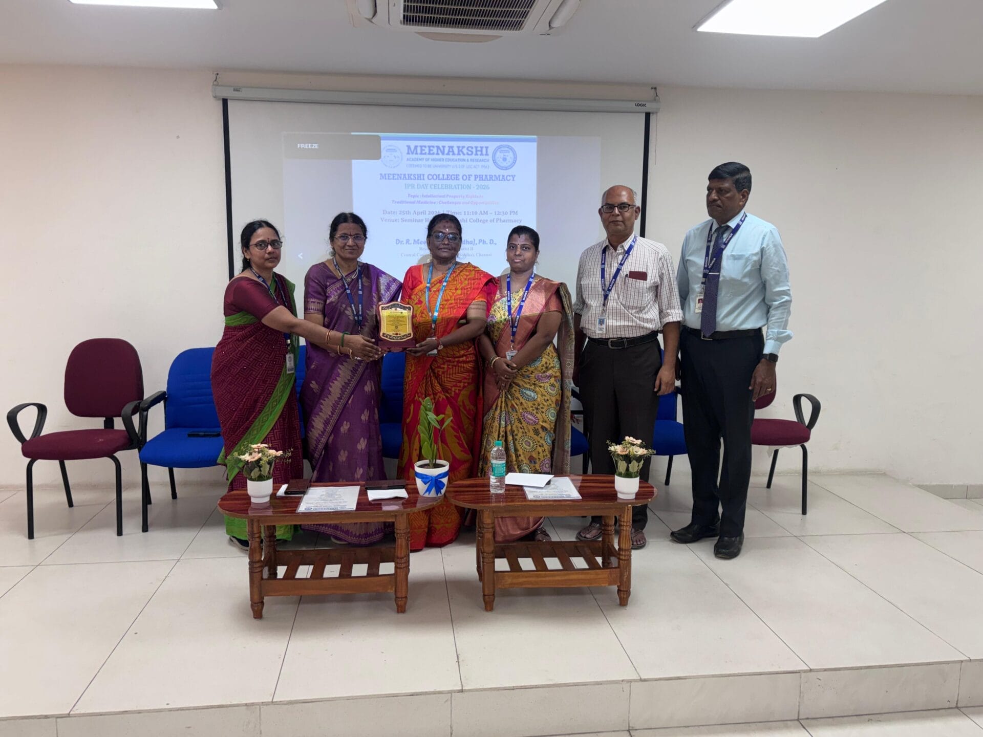 The IPR Cell of Meenakshi College of Pharmacy, Chennai, successfully organized the “IPR Day Celebration – 2026” on 25th April 2026 at the Seminar Hall from 11:10 AM to 12:30 PM, with the participation of 62 students. The programme aimed to create awareness about Intellectual Property Rights (IPR), particularly in the context of traditional medicine.