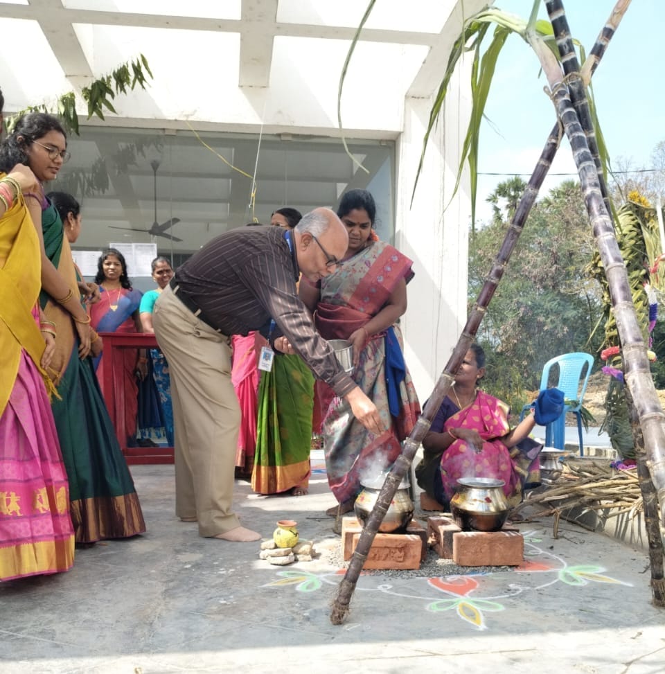 A major highlight of the celebration was the Pongal preparation and ritual observance, symbolizing prosperity, gratitude to nature, and communal harmony. Students and faculty members enthusiastically took part in the traditional Pongal cooking, adding warmth and meaning to the occasion. The programme was further enriched by an elegant dance performance by first-year students, which added grace and festive charm to the event.