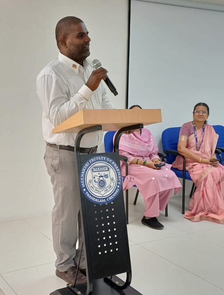 The program featured a series of expert sessions by eminent resource persons, including Prof. Dr. D. Chamundeeswari, Dr. Anitha (Deputy Registrar – Admin, MAHER), Dr. Burmice (Associate Dean – Student Welfare, MAHER), Prof. Dr. K.K. Rajasekar, Prof. Dr. L. Karpagavalli, Dr. Ponmurugan (Dean – Doctoral Studies, MAHER), Mr. Sri Jayaram (Director, IIC MAHER), Mr. K. Pandian (Sai Mirra Innopharm Pvt. Ltd.), Mr. Andrew (HR, Apex Laboratories Pvt. Ltd.), Dr. Swarnalakshmi (TCS, Pharmacovigilance), Mr. D. Bharathiraja (Spinco Biotech, Chennai), and Dr. Santhanakrishnan (Associate Dean – Accreditation, MAHER).