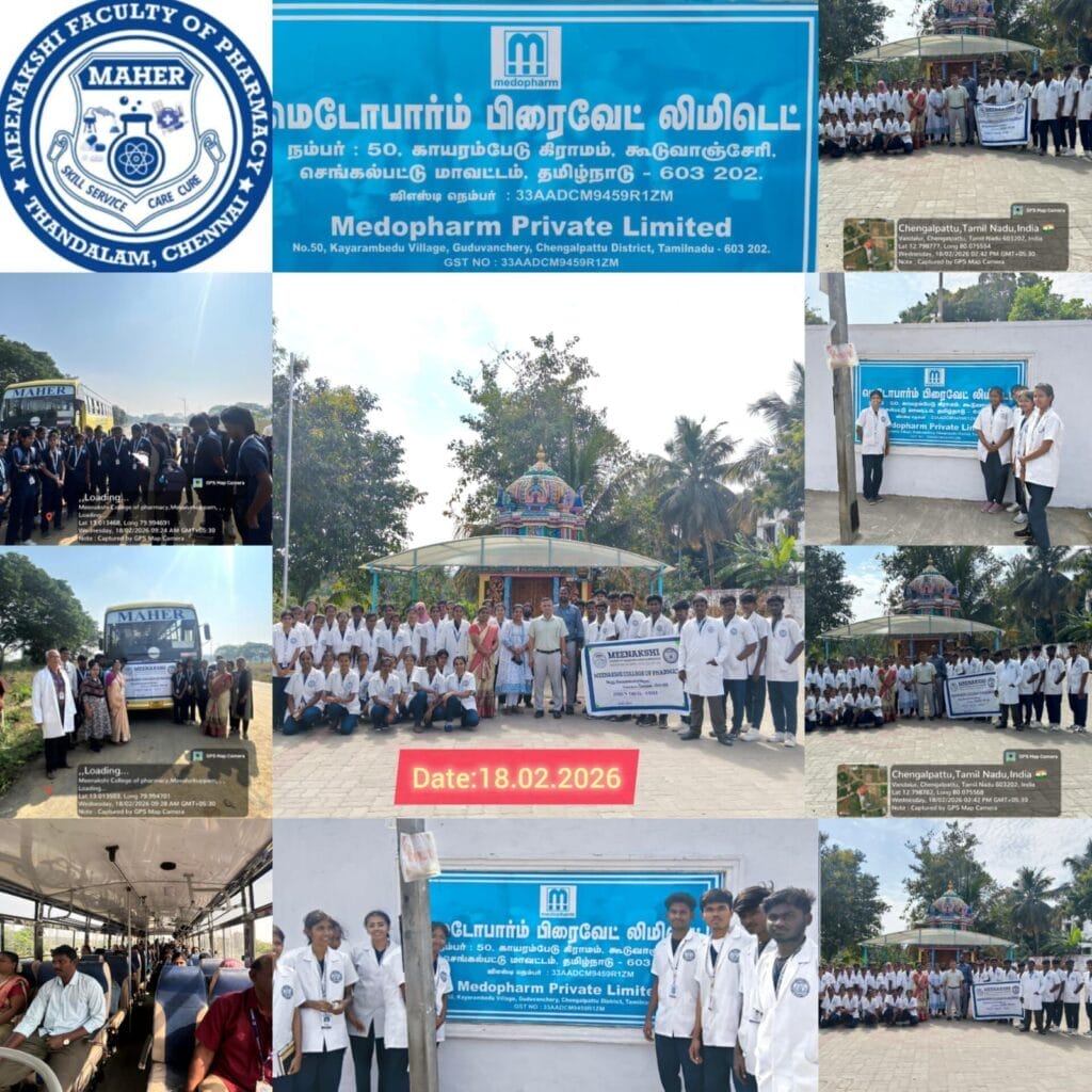 The first-year B.Pharm students of Meenakshi College of Pharmacy undertook an industrial visit to Medopharm Pvt. Ltd., located at Kairampedu, Guduvanchery, on 18th February 2026. The visit was organized as part of the academic curriculum to provide students with practical exposure to pharmaceutical manufacturing and quality control processes.