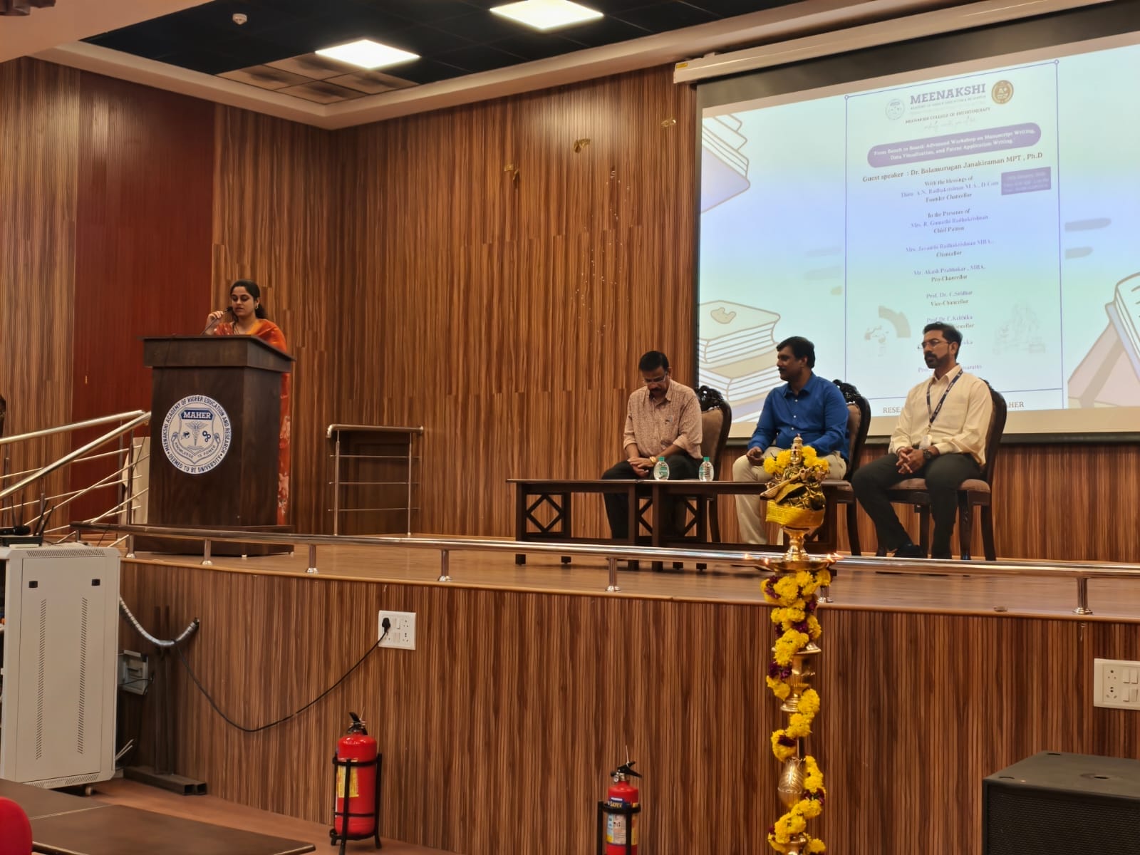 The programme was formally inaugurated in the presence of Prof. Dr. Arunagirinathan, Dean of Research, MAHER, and Prof. Dr. Parthasarathy R, Principal, Meenakshi College of Physiotherapy. The programme was organized under the leadership of Prof. Dr. Mahesh Kumar PG, MAHER, reflecting the institution’s continued focus on research capacity building and academic excellence.