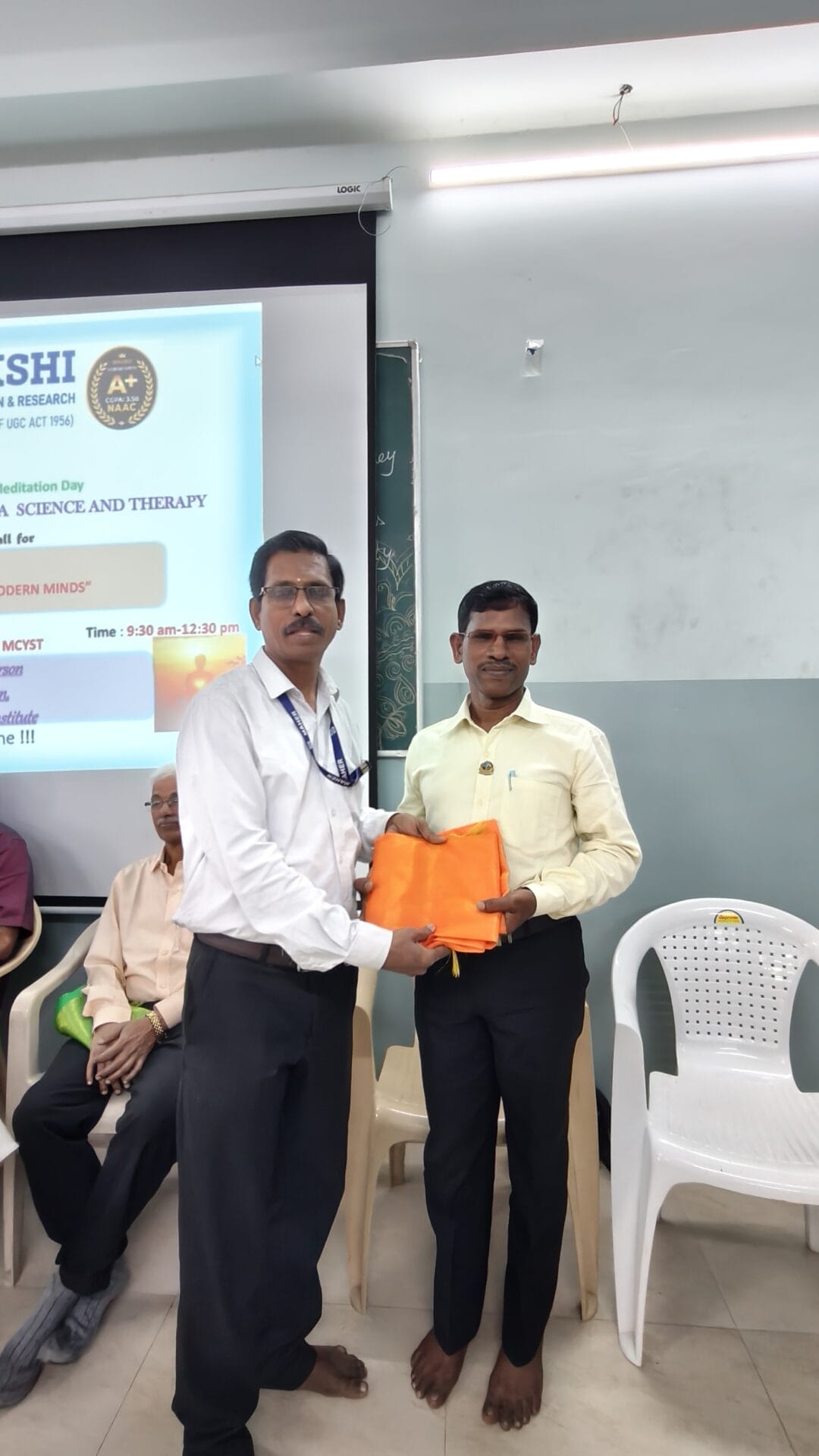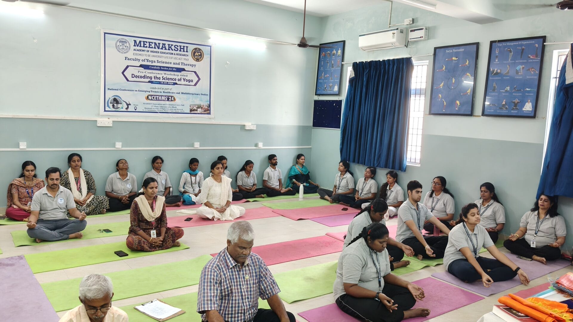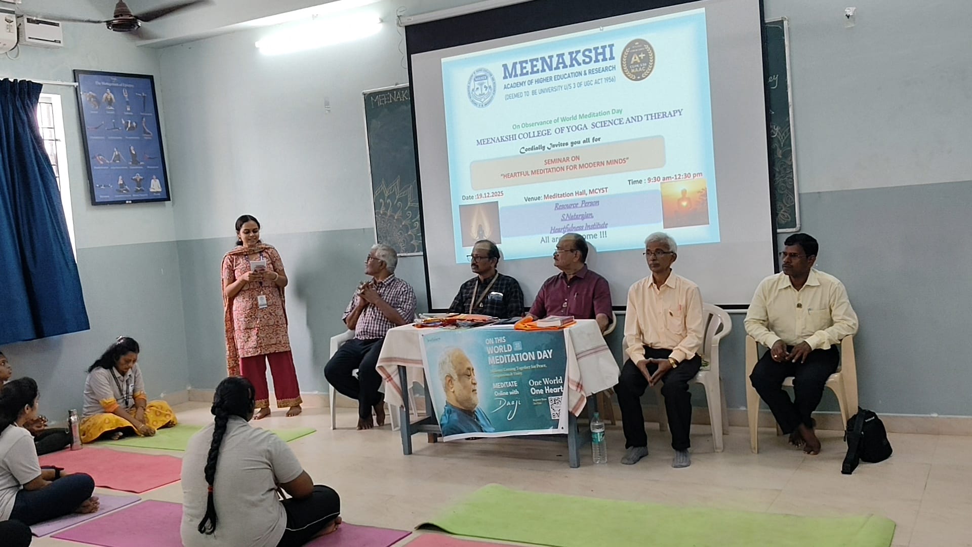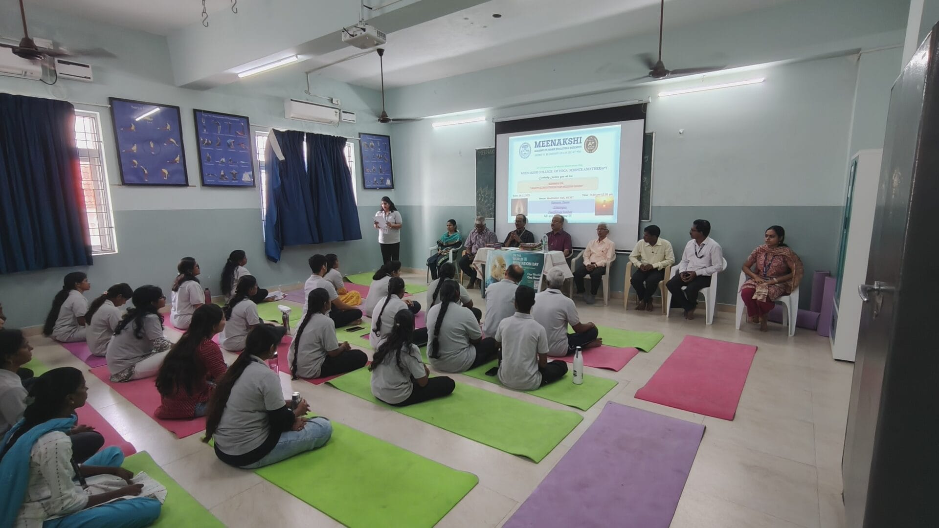 The Department of Meenakshi College of Yoga Science and Therapy, MAHER, organized a seminar in observance of World Meditation Day on 19 December 2025 from 10.00 a.m. to 12.00 noon, with the objective of promoting mental well-being, emotional balance, and self-awareness among students. The programme commenced with a prayer, creating a calm and reflective atmosphere, followed by a welcome address that highlighted the relevance of meditation in managing the stresses and challenges of contemporary life.