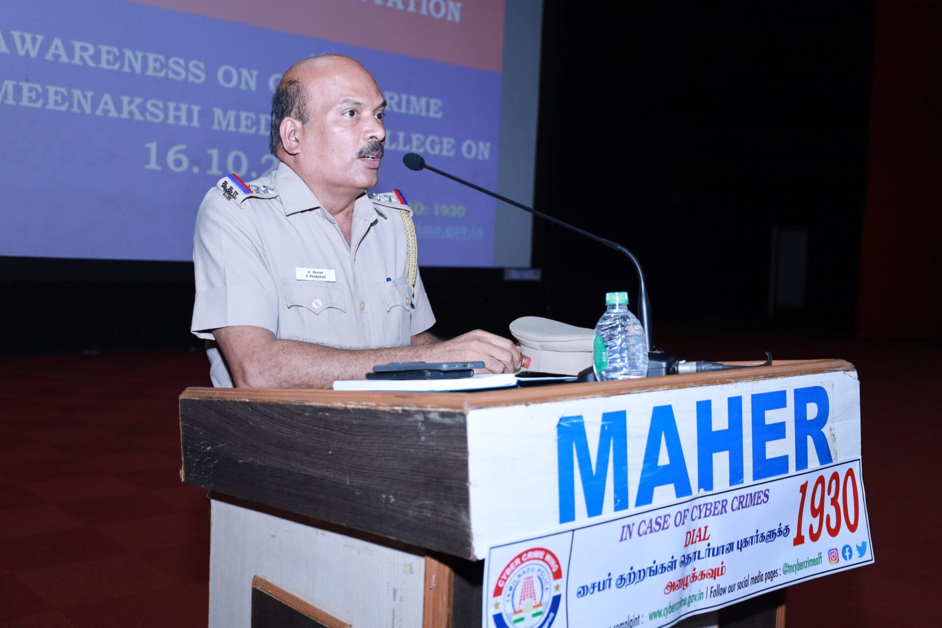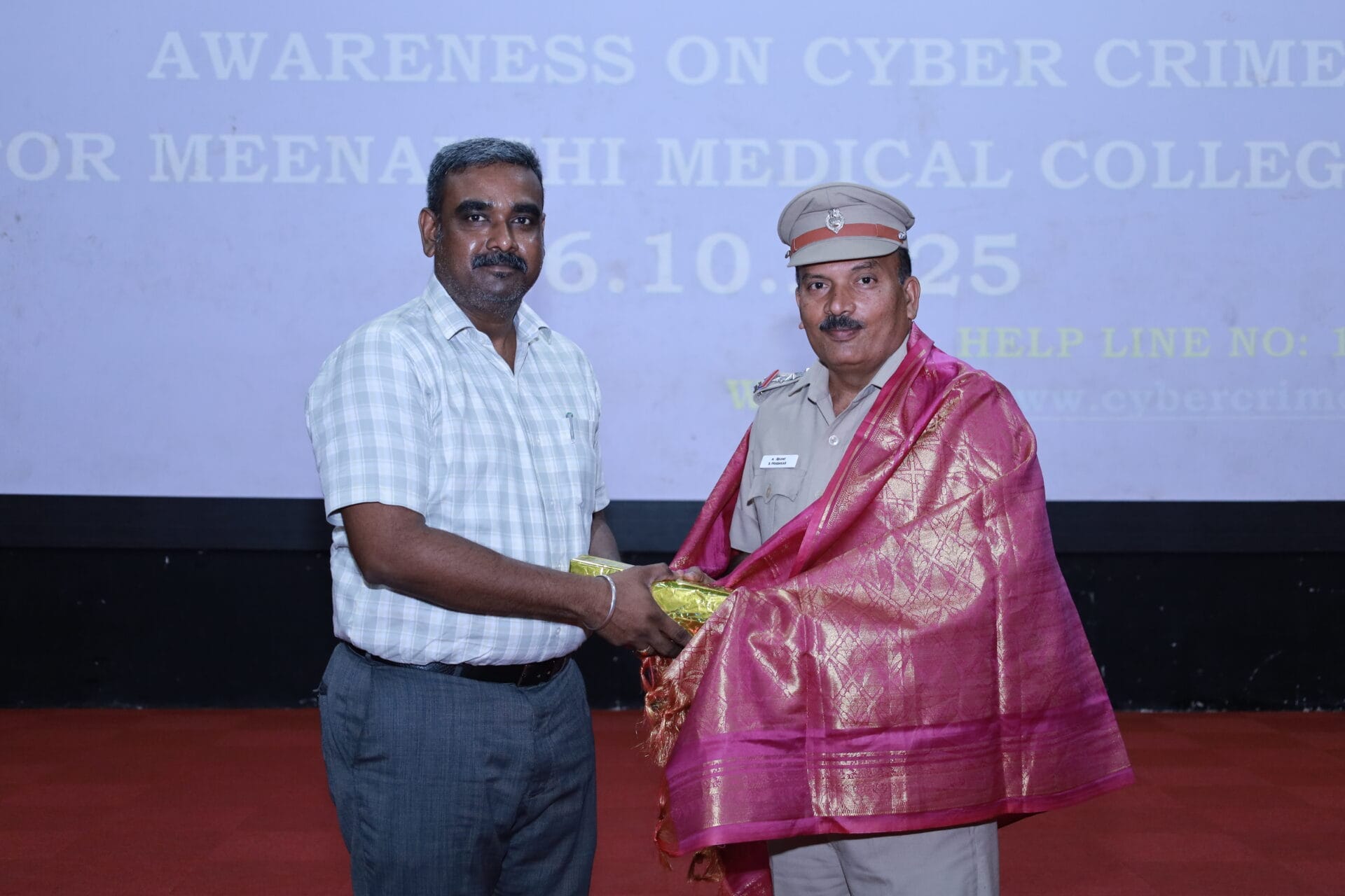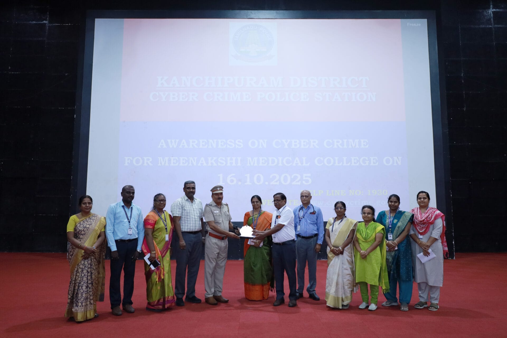 The Medical Education Unit of Meenakshi Medical College Hospital & Research Institute (MMCHRI) organized a Cyber Security Awareness Programme on 16th October 2025 at the college auditorium.The session featured Tr. S. Prabakar, Inspector of Police, Cyber Crime Police Station, Kanchipuram District, as the Chief Guest, who delivered an insightful address on the growing challenges of cybercrime and the importance of digital safety. He emphasized the need for responsible online behavior, vigilance against cyber threats, and the role of students in spreading awareness about cyber safety within society.