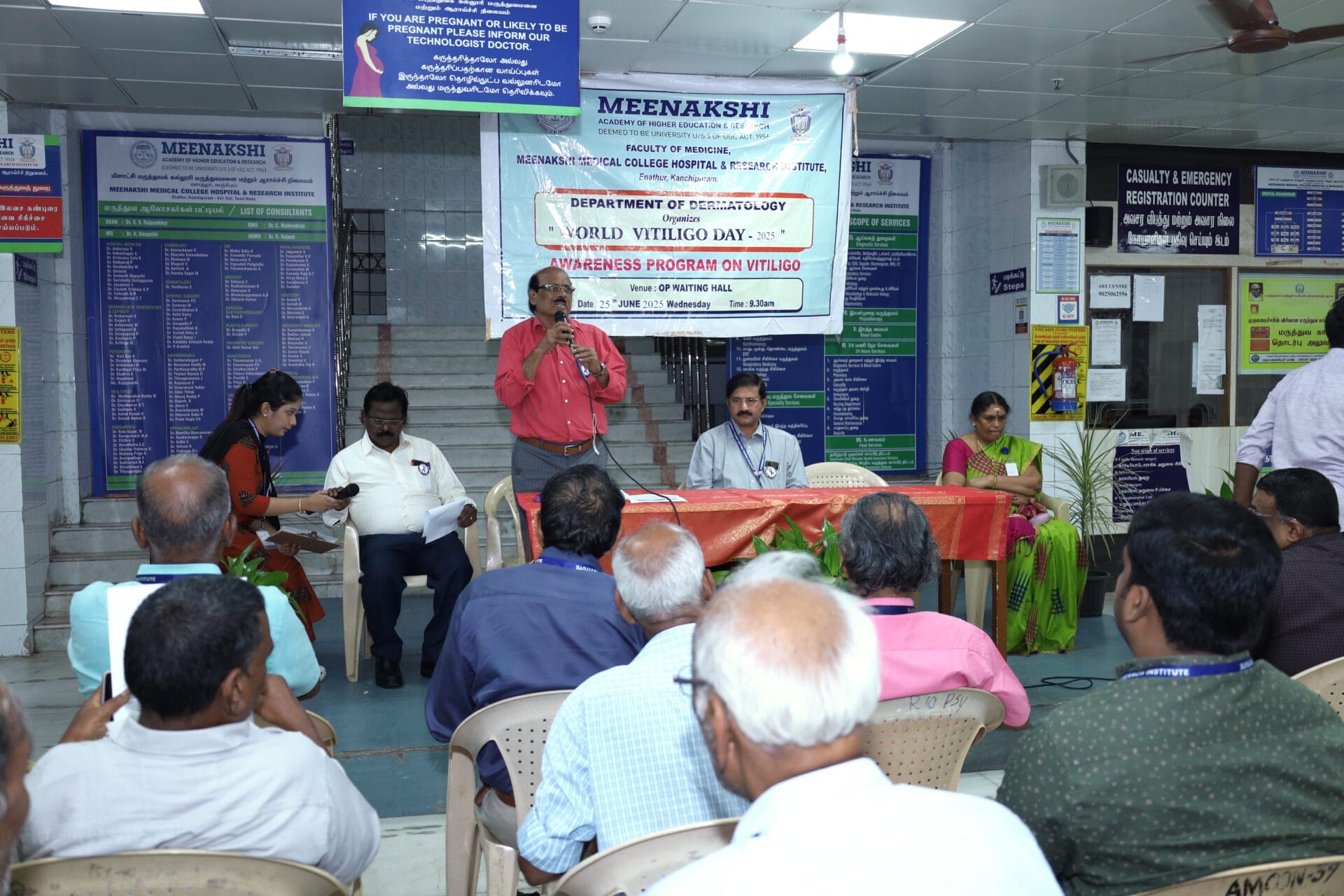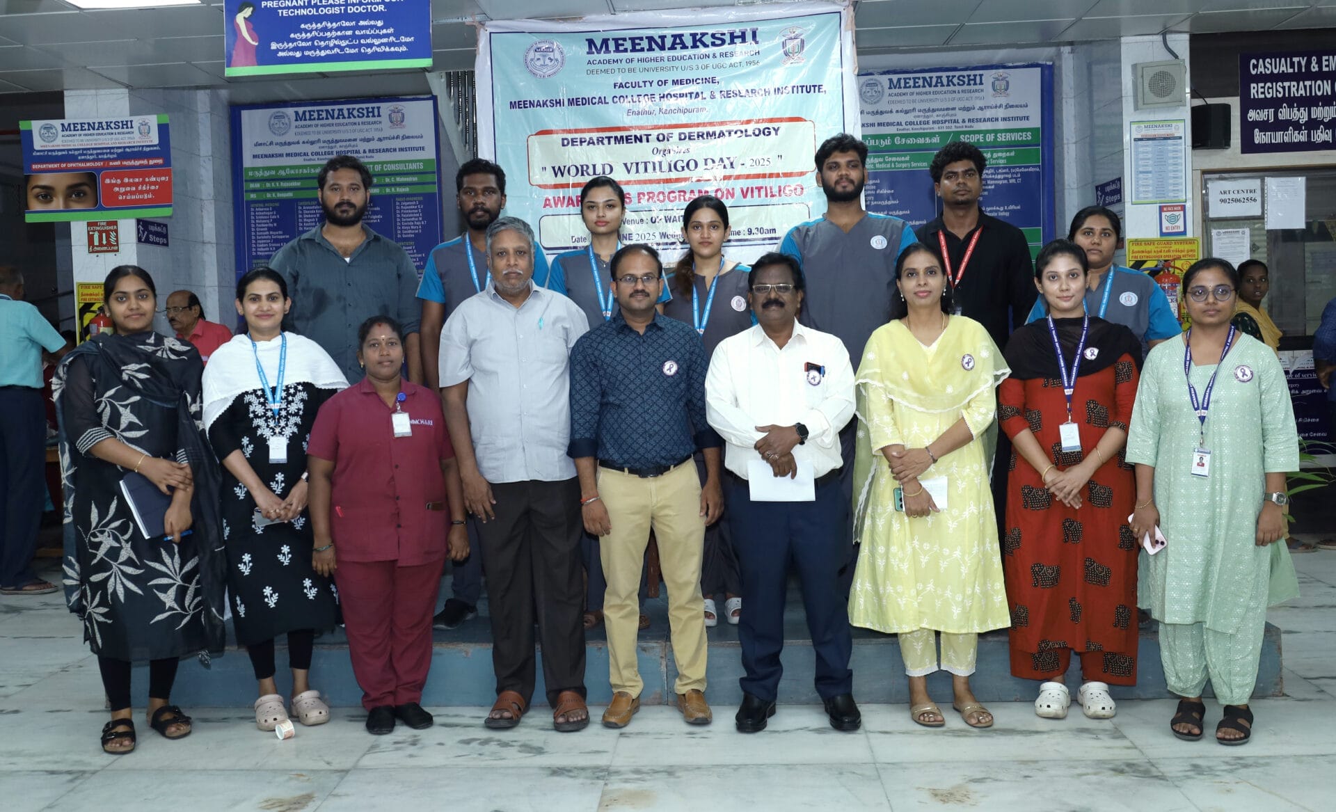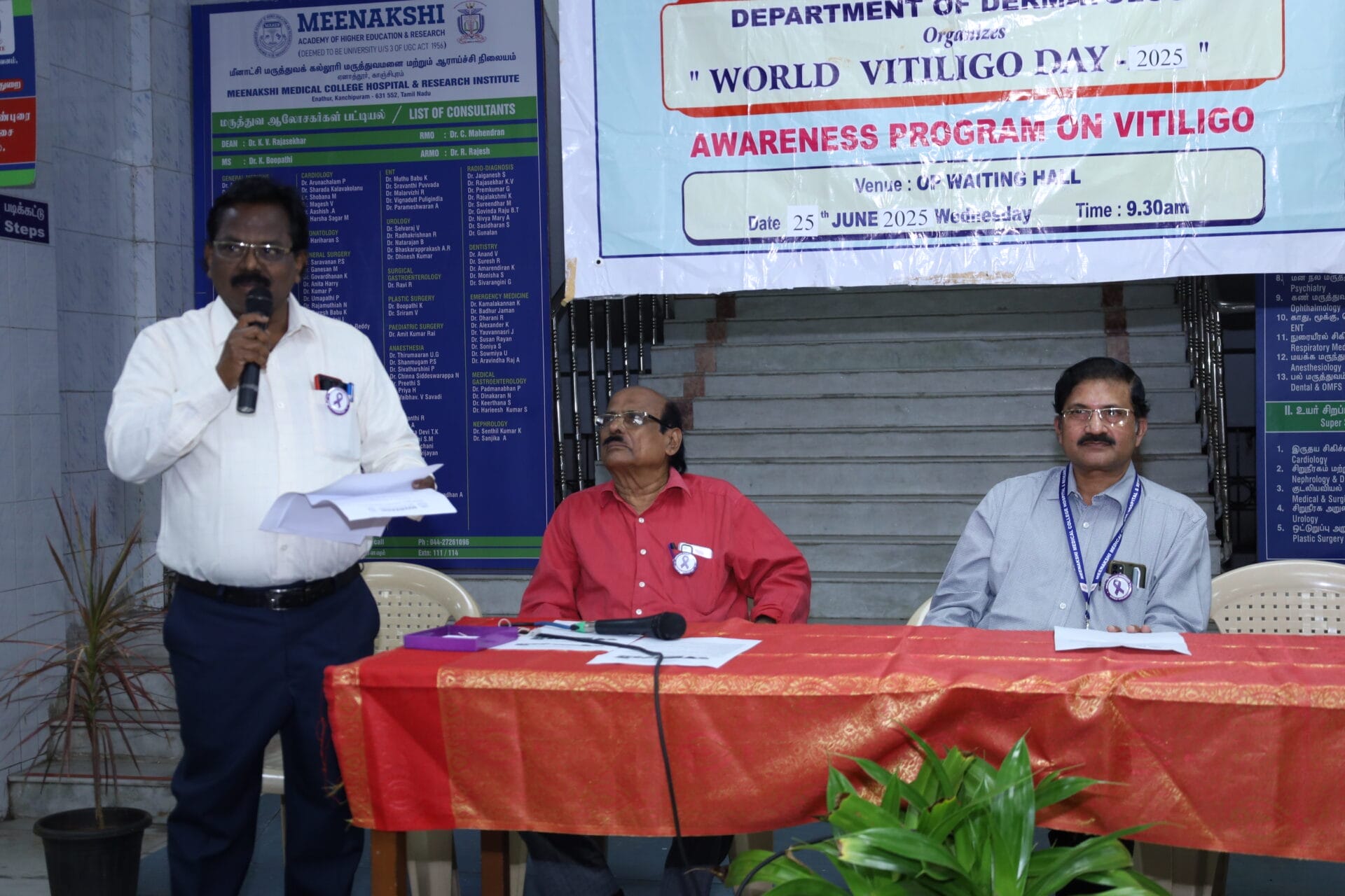 The World Vitiligo Day Awareness Program 2025 was successfully organized by Meenakshi Medical College Hospital and Research Institute (MMCHRI) on 25th June 2025, from 9:30 AM to 10:30 AM. The event aimed to raise awareness about vitiligo, break social stigma, and promote empathy and understanding towards those affected by the condition.