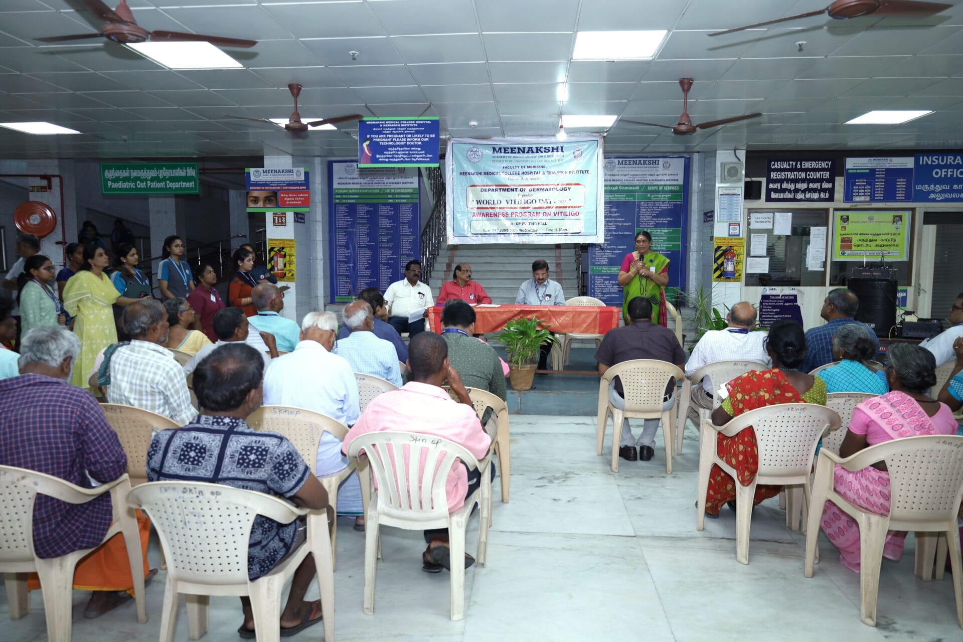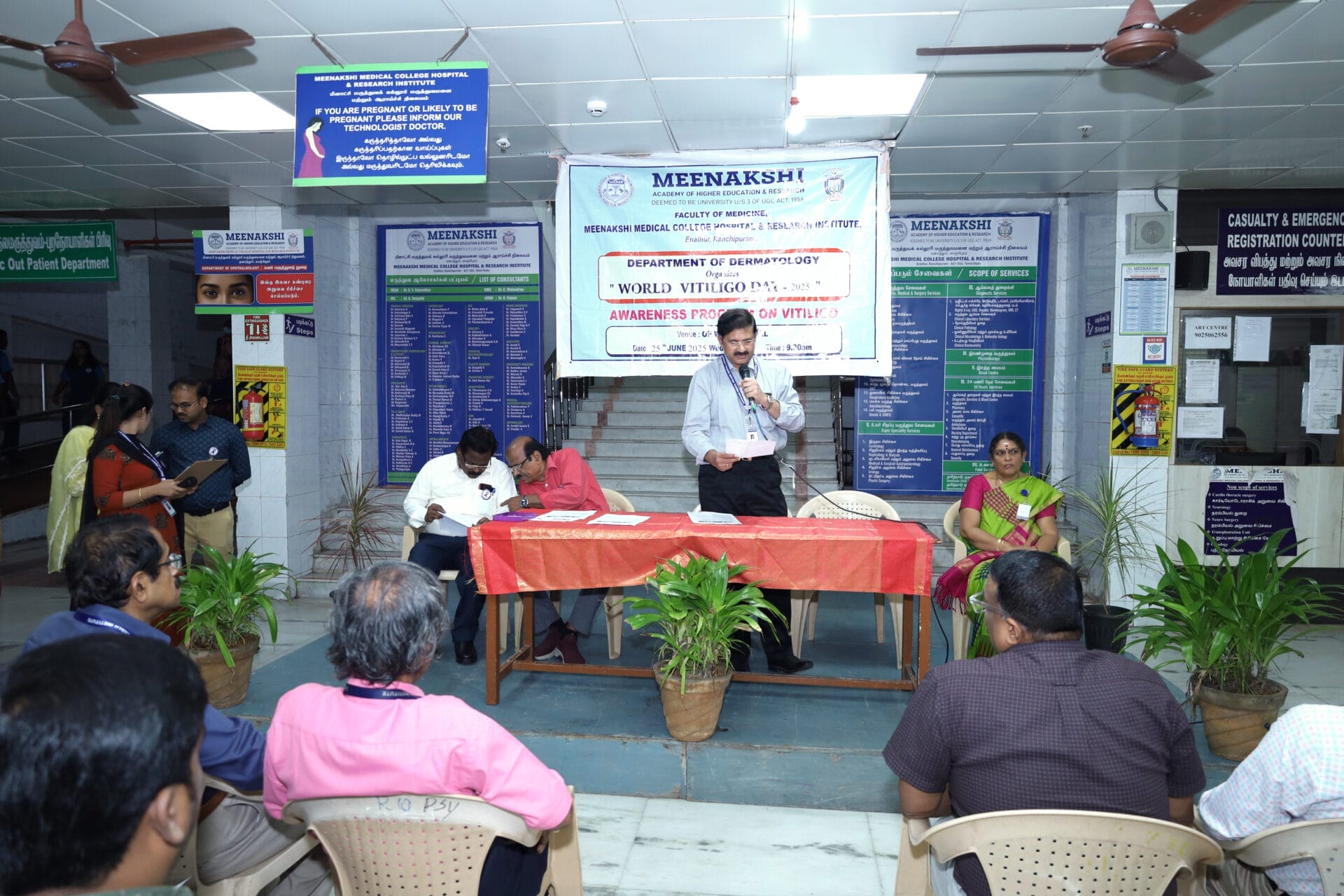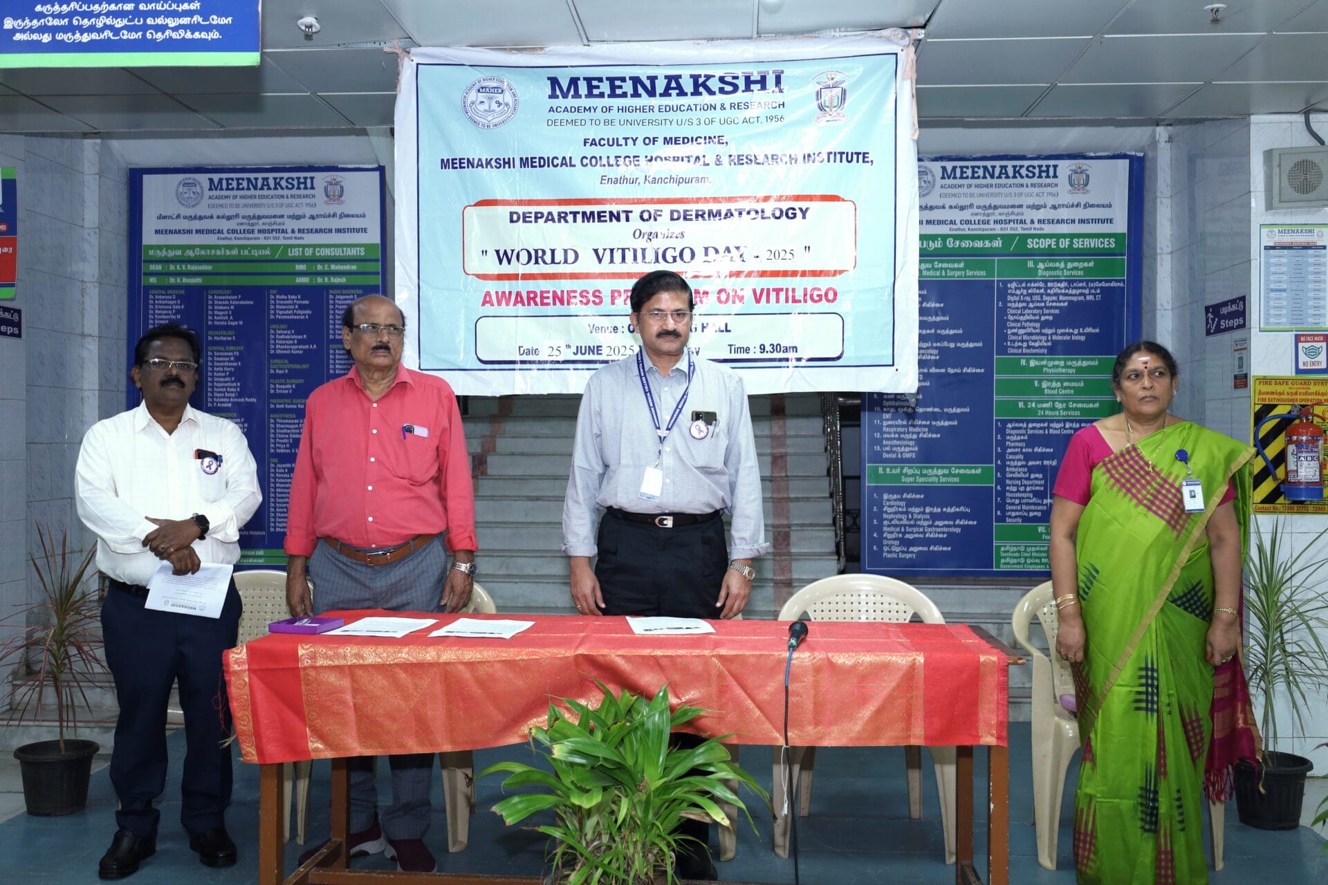 The World Vitiligo Day Awareness Program 2025 was successfully organized by Meenakshi Medical College Hospital and Research Institute (MMCHRI) on 25th June 2025, from 9:30 AM to 10:30 AM. The event aimed to raise awareness about vitiligo, break social stigma, and promote empathy and understanding towards those affected by the condition.