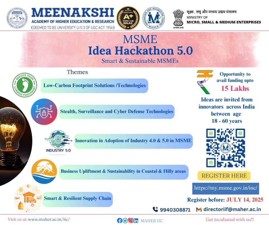 The Ministry of Micro, Small, and Medium Enterprises (MSME) has launched MSME Idea Hackathon 5.0 as part of the MSME Innovative Scheme. Innovators aged between 18-60 are invited to submit their ideas under this initiative. The MSME Idea Hackathon 5.0 is now live at https://my.msme.gov.in/inc/ and the application will remain open until 14th July 2025. For any assistance contact +91 9940308871 or mail at directoriif@maher.ac.in