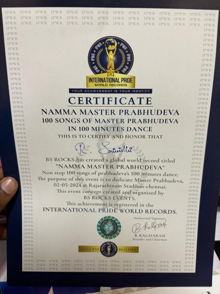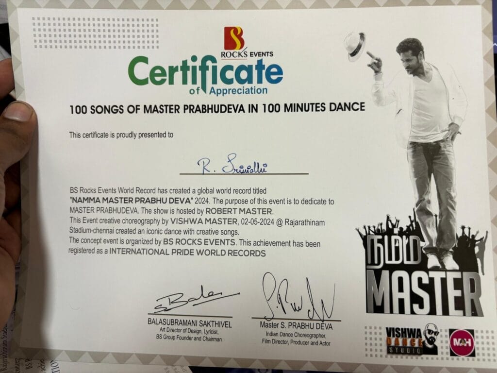 Ms. Srinidhi, III year student of B.Com corporate secretaryship from Faculty of Humanities and Science achieved Global World Record titled “NAMMA MASTER PRABHUDEVA” – Non stop 100 songs of Prabhudeva’s 100 minutes dance conducted on 02-05-2024 at Rajarathinam stadium, Chennai. This achievement is registered in the International Pride World Records