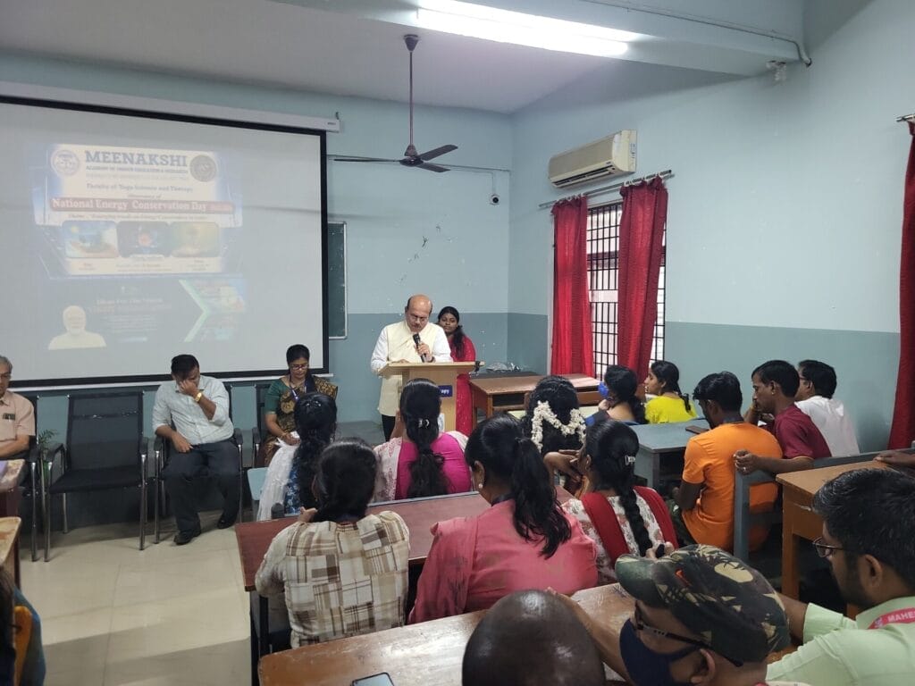 Faculty of Yoga Science and Therapy conducted the National Energy Conservation Day on 03.01.2024 at MAHER, K.K Nagar campus. In this regard, competitions on Essay writing on the theme of “Challenges on Solar Energy Conservation” and debate on the theme of “Who is most responsible in Energy Conservation Individual or Government” were conducted on 29.12.2023 at the faculty of Yoga Science and Therapy, MAHER campus. Students from all the Faculties of MAHER campus participated in the competitions. A Special Guest lecture on the theme of “Emerging Trends on Energy Conservation in India” was arranged on 03.01.2024. The chief guest Shri Suresh fondly known as Solar Suresh, a Social Worker delivered a guest lecture with excellent concepts, methods and opportunities with his personal experiences, which motivated the students about energy resources and conservation. The lecture ended with the distribution of prizes to the winners of the competitions. A total of 110 members of MAHER including staff members, students and scholars participated in this event.