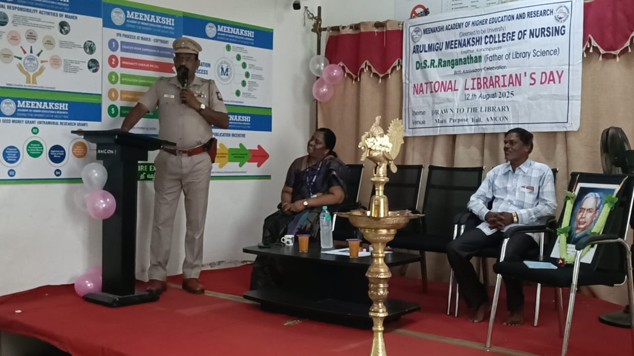 Arulmigu Meenakshi College of Nursing (AMCON) observed National Librarian’s Day on 12th August 2025 at the AMCON Multipurpose Hall. The event began with a melodious invocation song by AMCON students, setting a solemn and respectful tone.