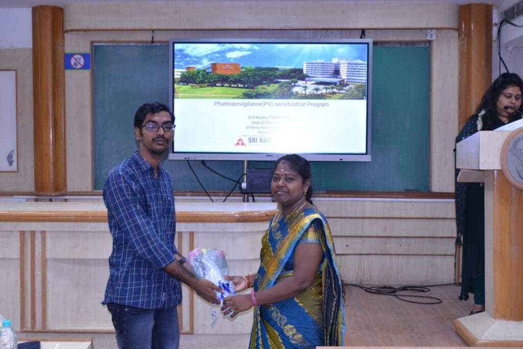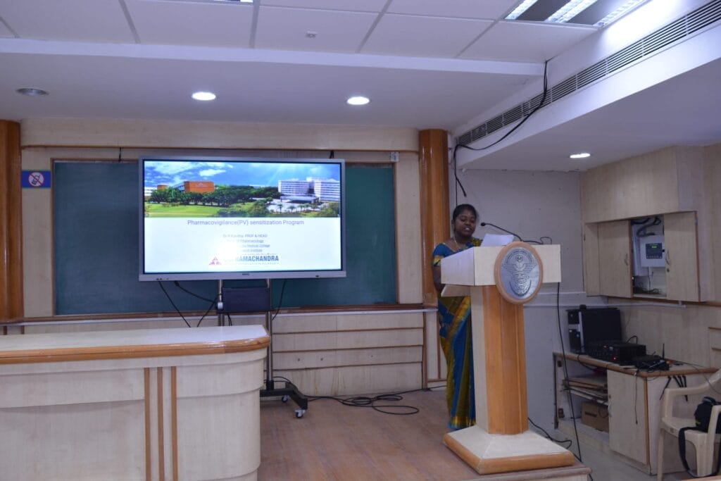 Under the directions of DCI, an awareness programme was arranged to celebrate National Pharmacovigilance week from 17th to 23rd September 2023. It was conducted on 23rd September 2023 by the Dept. of Pharmacology, MADCH. The chief guest Dr.R.Kavitha, Professor & Head, Dept. of Pharmacology, Sri Ramachandra Medical College, SRIHER graced the occasion. She gave an enlightening talk on “All about Pharmacovigilance” which gave a candid insight into the topic. Dr.Bettina coordinated the events of the meeting and Dr. P. Subbulakshmi welcomed the gathering and read about the personal achievements of the chief guest. The chief guest sensitized the audience about pharmacovigilance and medical devices vigilance. She highlighted the significance of ADR reporting and the sequel of events that follow ADR reporting. Mr.Prasath Kumar, Pharmacovigilance Associate, SRMC-AMC, SRIHER explained how to fill the ADR Forms which can be downloaded from the website of Indian Pharmacopoeia Commission. Dr.R.Kavitha interacted with the audience who were mostly students by asking them questions from the lecture. The audience responded well. Finally the organizing secretary,   Dr.T.Vedavijaya, Professor & Head gave a thought provoking lecture on the selected topic and the programme was concluded with vote of thanks which was delivered by Dr.S.Prathiba. Memento was presented to the chief guest and Mr.Prasath Kumar who accompanied the chief guest. The programme ended with the National Anthem.