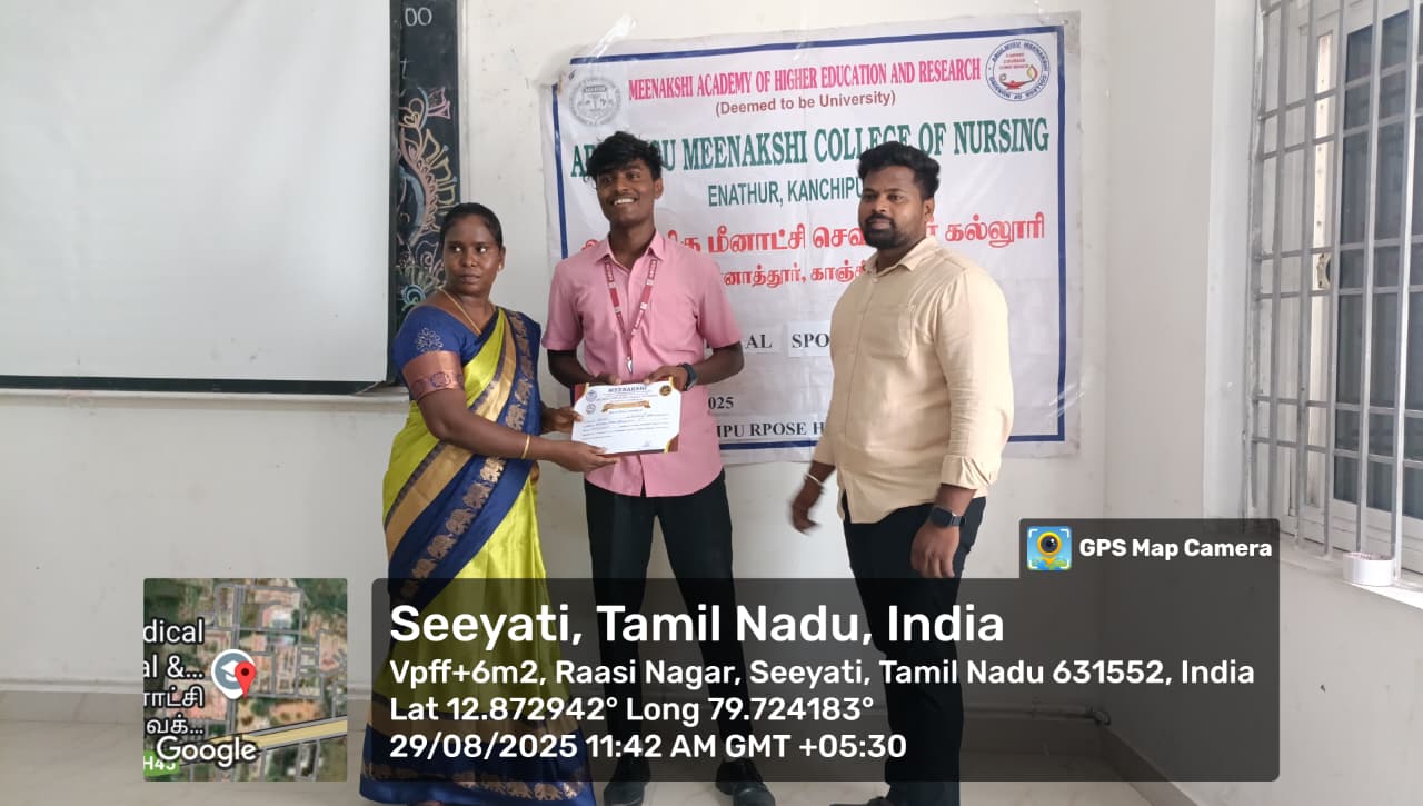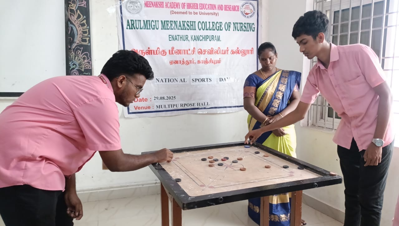 Arulmigu Meenakshi College of Nursing observed National Sports Day 2025 on 29th August 2025 with a vibrant programme held between 10.00 am and 12.00 pm. The event was conducted exclusively for B.Sc. (Nursing) students, with around 27 students enthusiastically participating in indoor sports activities such as chess and carrom (singles).