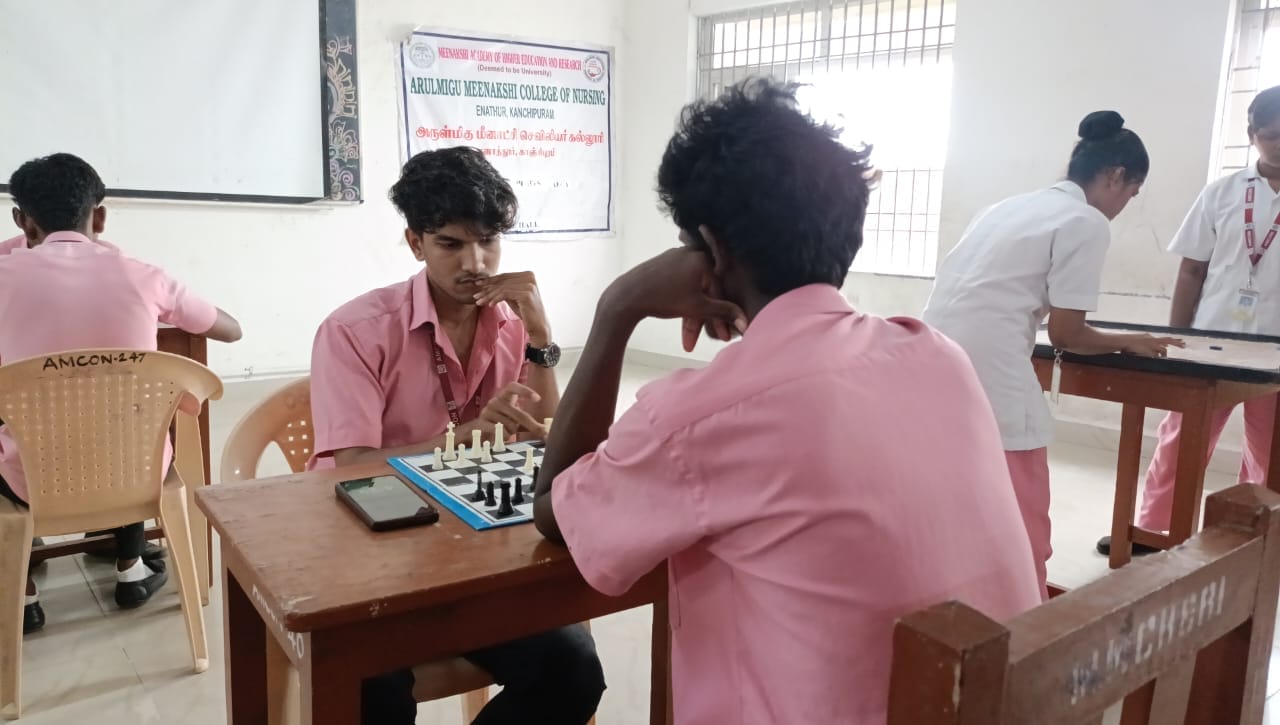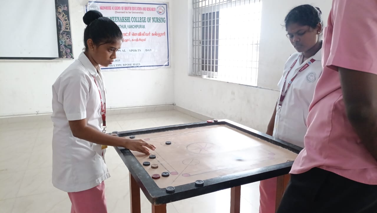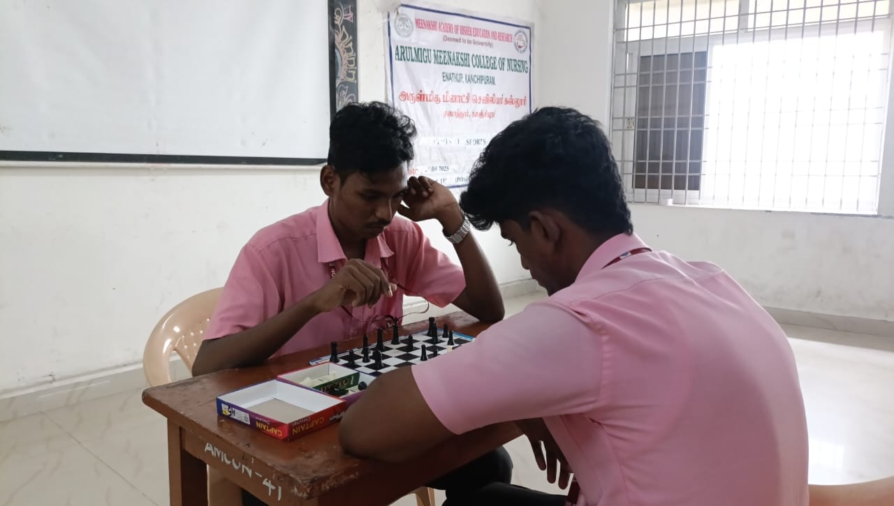 Arulmigu Meenakshi College of Nursing observed National Sports Day 2025 on 29th August 2025 with a vibrant programme held between 10.00 am and 12.00 pm. The event was conducted exclusively for B.Sc. (Nursing) students, with around 27 students enthusiastically participating in indoor sports activities such as chess and carrom (singles).