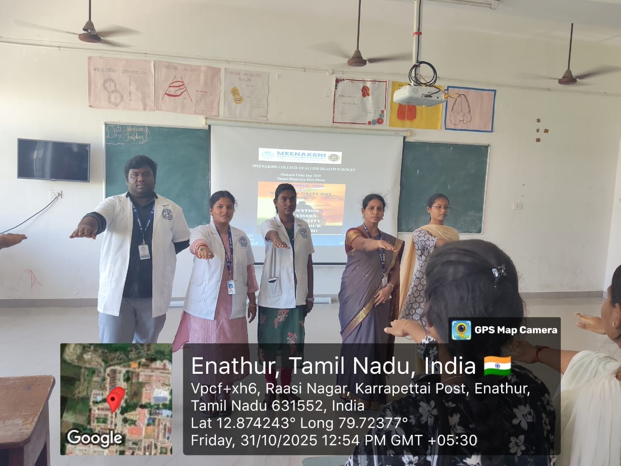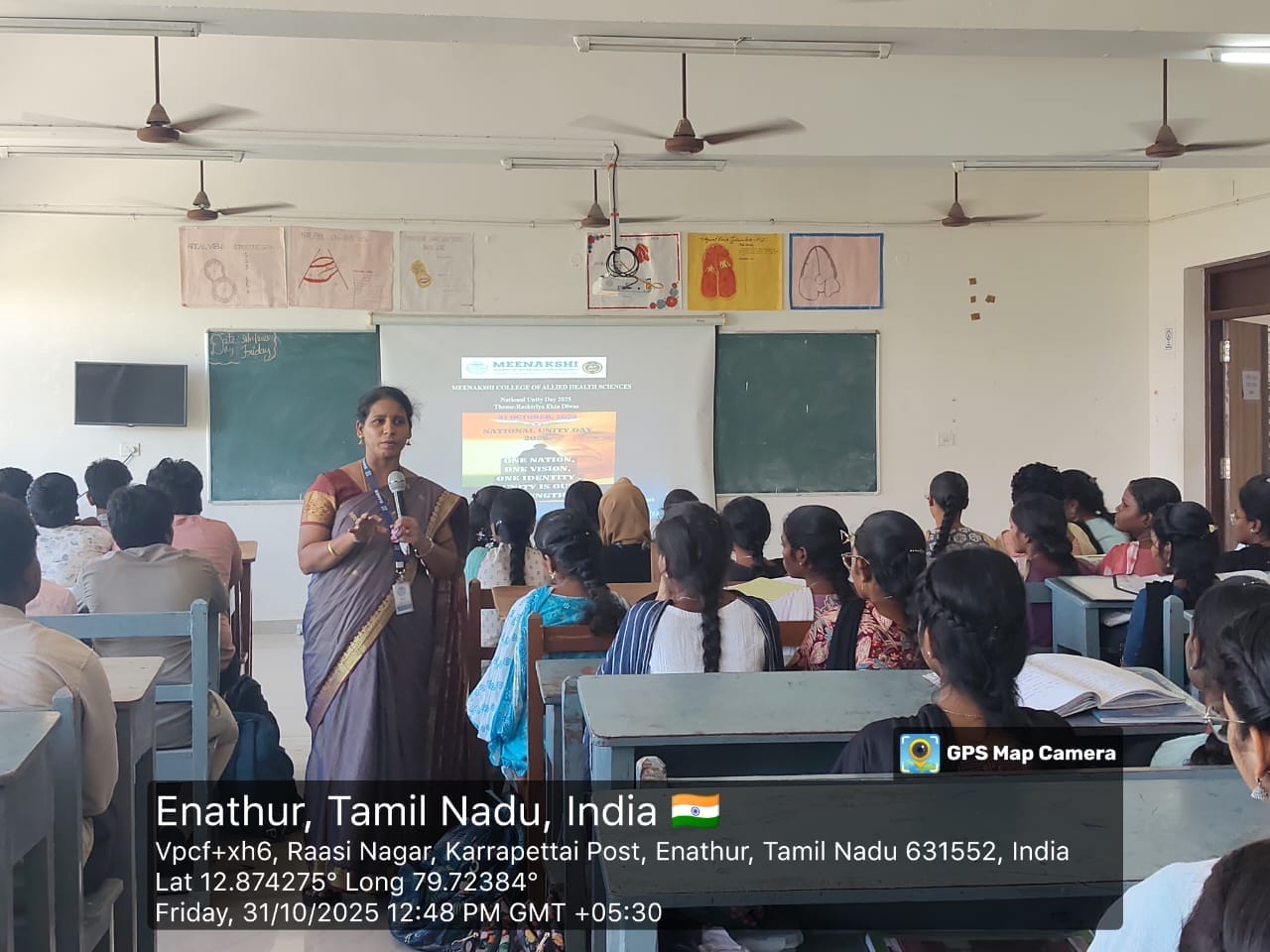 The Meenakshi College of Allied Health Sciences observed National Unity Day (Rashtriya Ekta Diwas) on 31st October 2025 to commemorate the birth anniversary of Sardar Vallabhbhai Patel, the Iron Man of India. The event aimed to promote the spirit of unity, integrity, and national security among students and staff members.