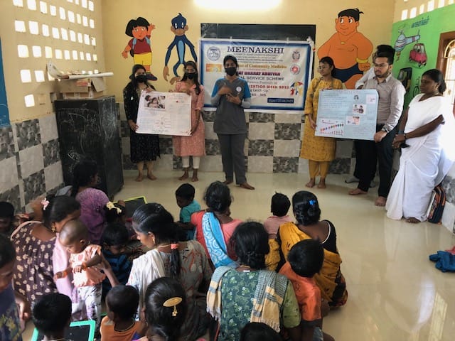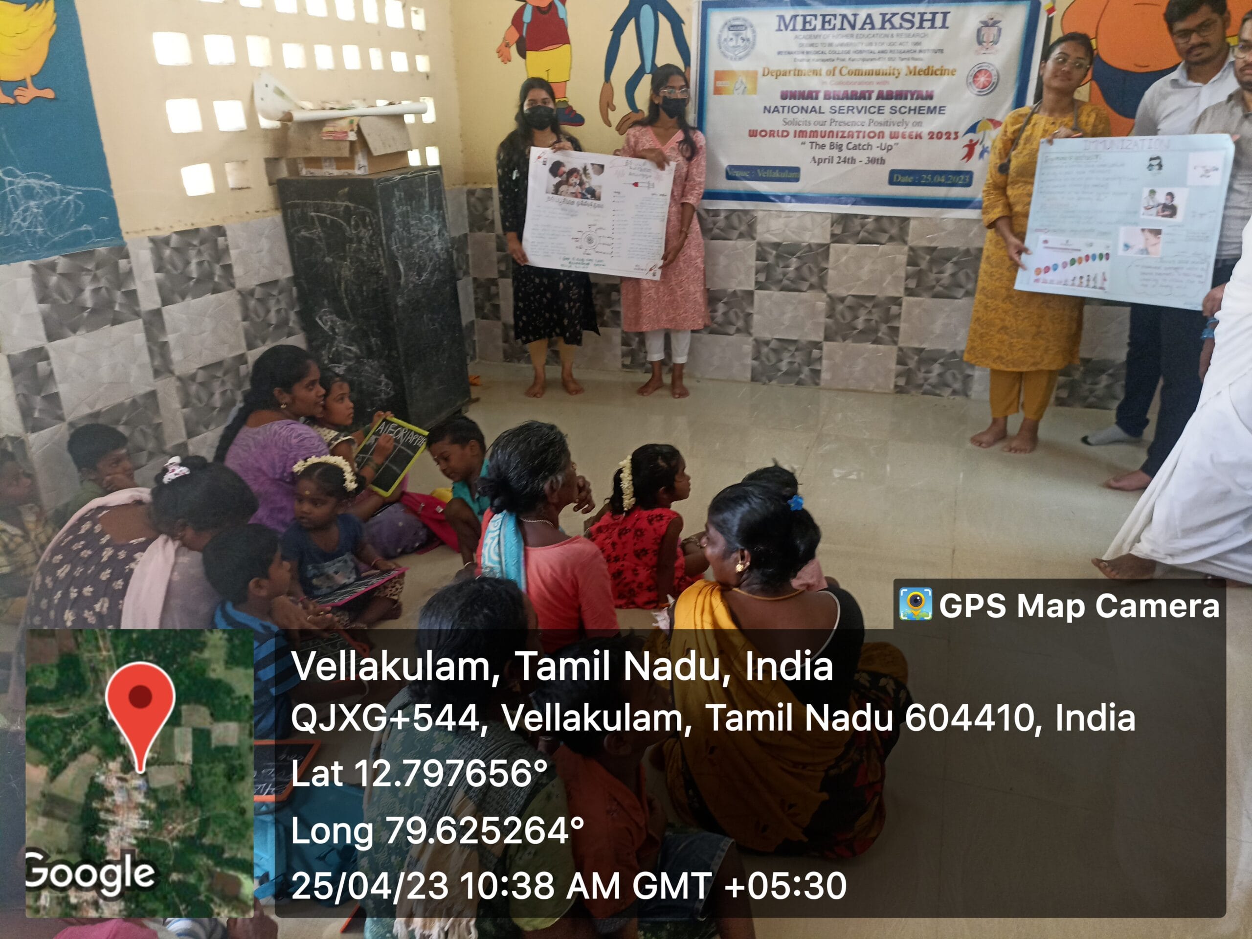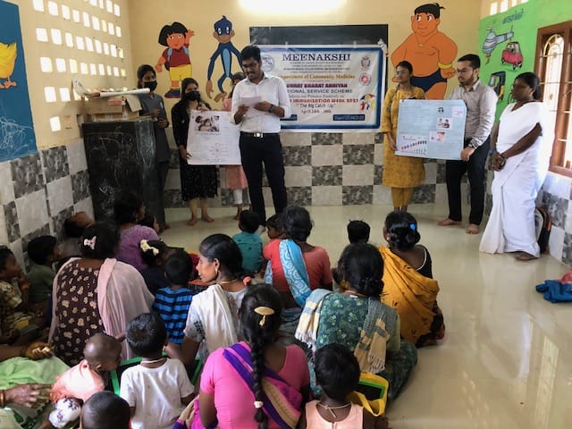 On the occasion of World Immunization week 2023, Health campaign awareness was conducted on the Vellakulam village Anganwadi centre on 25.04.2023 by the Department of Community Medicine, Unnat Bharat Abhiyan, and National Service Scheme. Under the guidance of Dean Dr. Rajasekhar, Dr. Shankar (Professor and HOD) and under the supervision of Dr.Pandiyan K.R Associate Professor & Dr. Gopinath.T.T, Assistant Professor, the programme was organised by all faculties and postgraduates of Department of Community Medicine. Welcome address given by Postgraduate and Importance of observing World Immunization week was given by the interns .There were about 40 members who participated in the campaign. At the end refreshments were distributed to the audience.