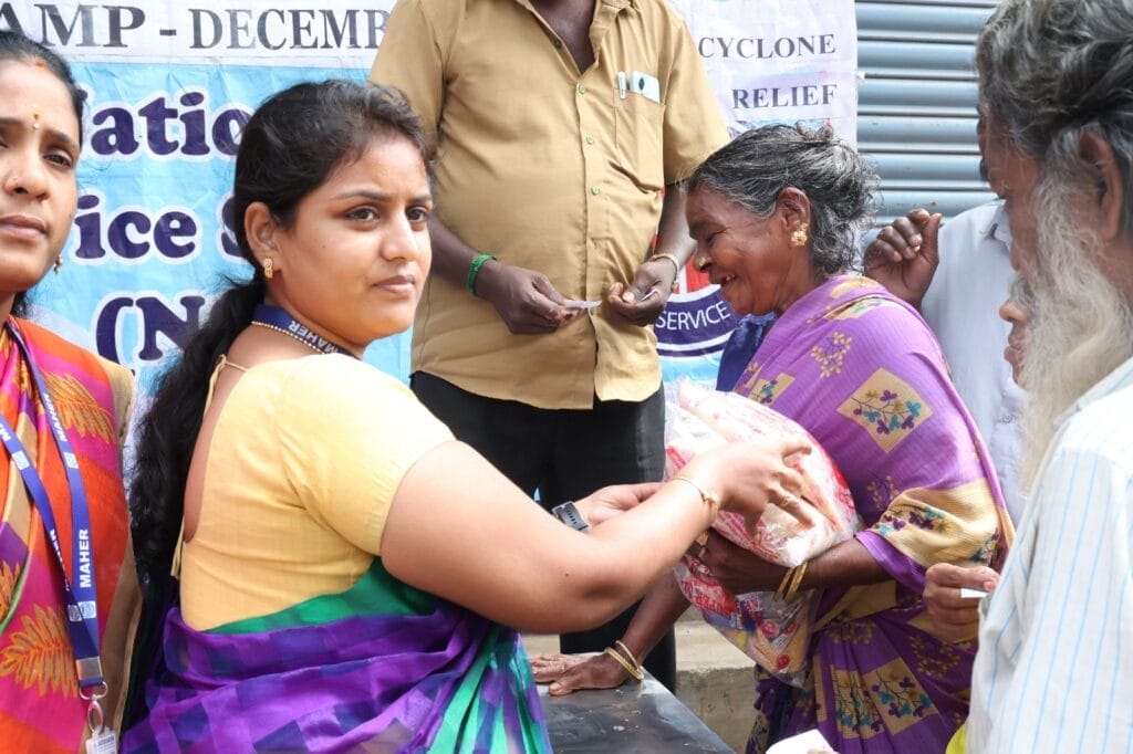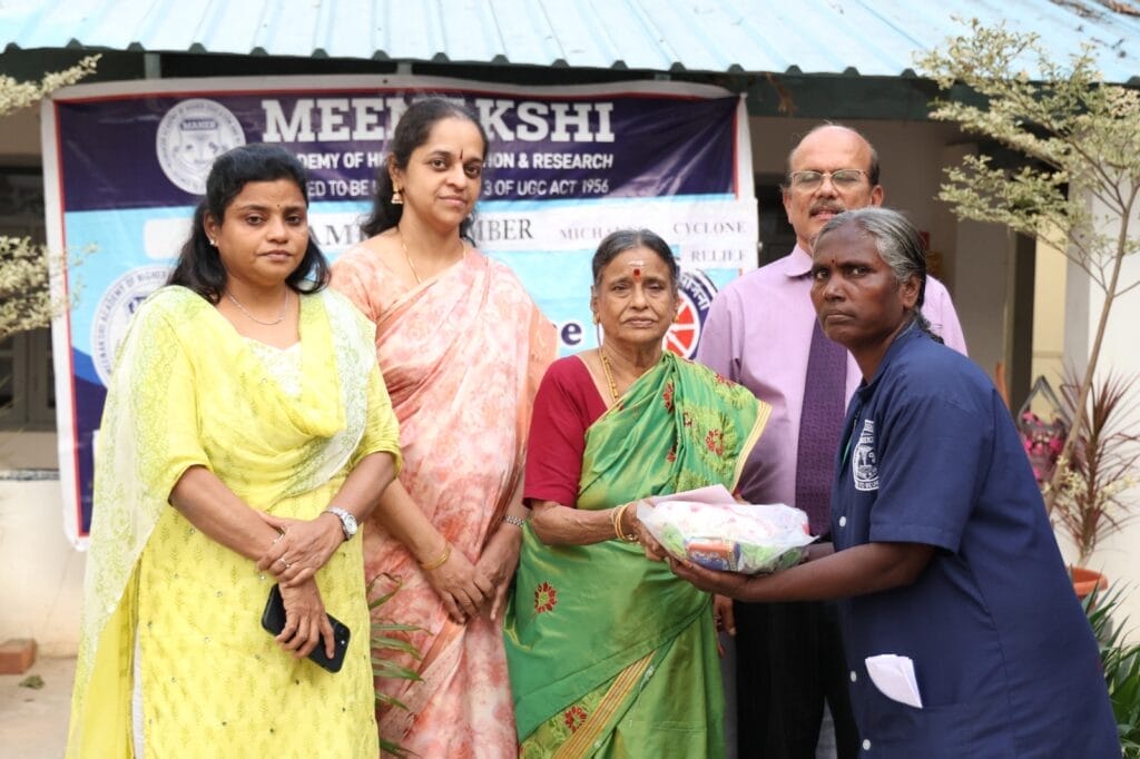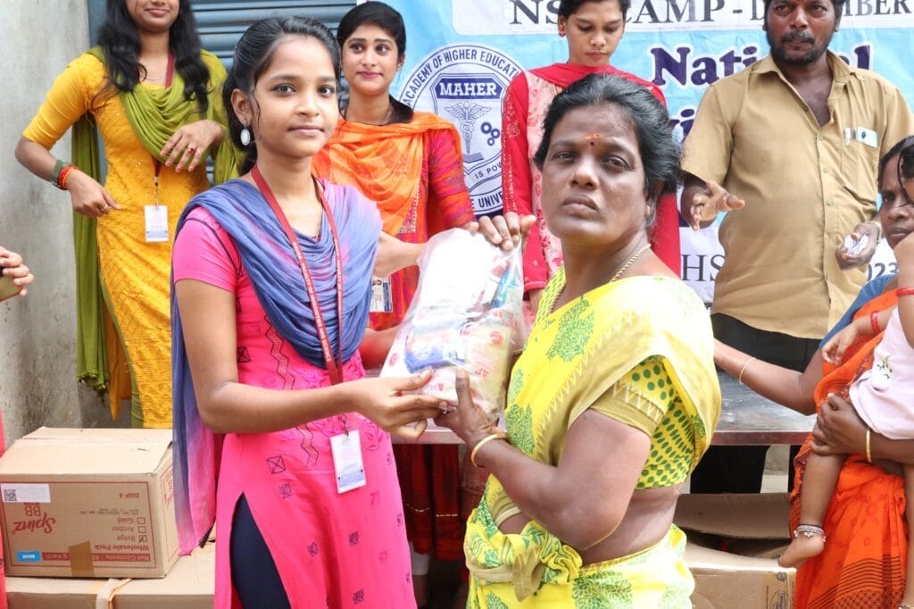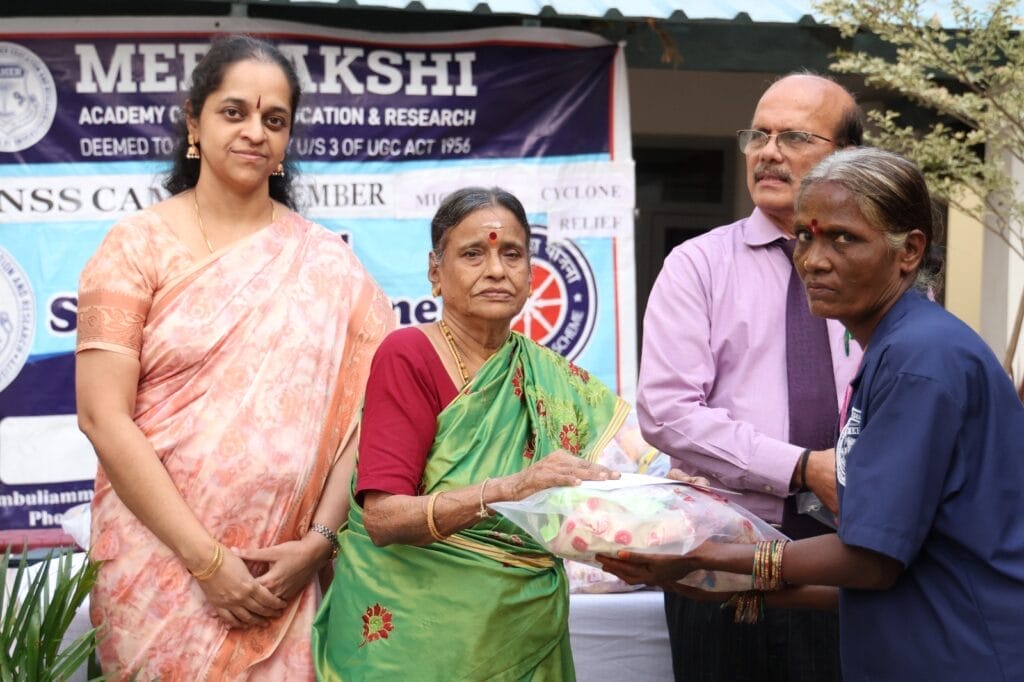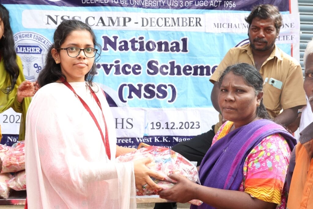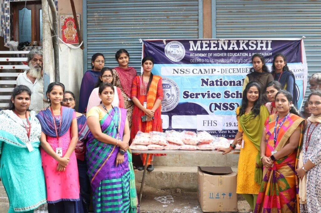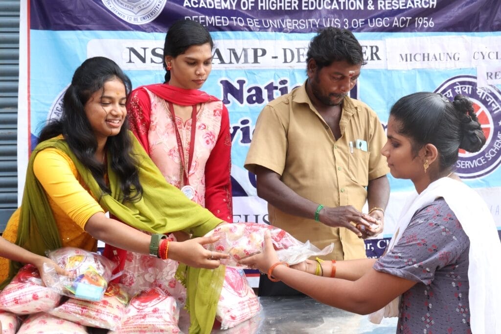 On December 19, 2023, the Faculty of Humanities and Science (FHS) under the National Service Scheme (NSS) initiative executed a relief operation aimed at relieving the distress experienced by individuals by the Michaung Cyclone. The undertaking focused on Choolai Pallam MGR Nagar, Chennai, targeting residents whose economic provisions had been significantly affected by the cyclonic event. In this philanthropic undertaking, the team distributed a total of 160 food packets, each valued at Rs. 250, to the identified beneficiaries. The packets were distributed to the residents of Choolai Pallam MGR Nagar.