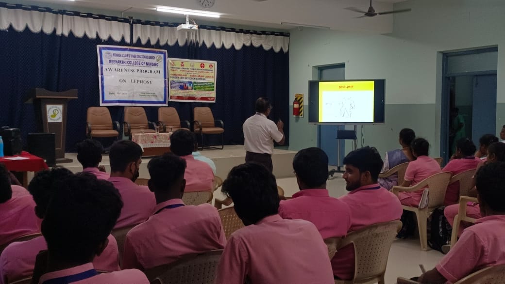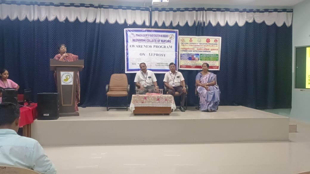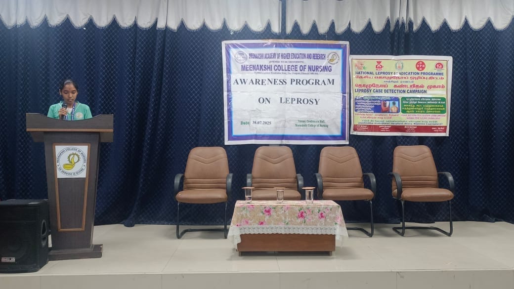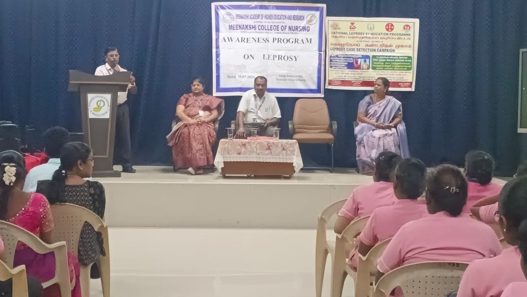 The NSS Unit of Meenakshi College of Nursing organized an awareness programme on Leprosy on 30th July 2025 at the Conference Hall, MCON, with the aim of educating nursing students on the importance of early detection, prevention, and elimination of leprosy. The event was coordinated by Mrs. R. Jebin Sherly, Associate Professor, MCON.