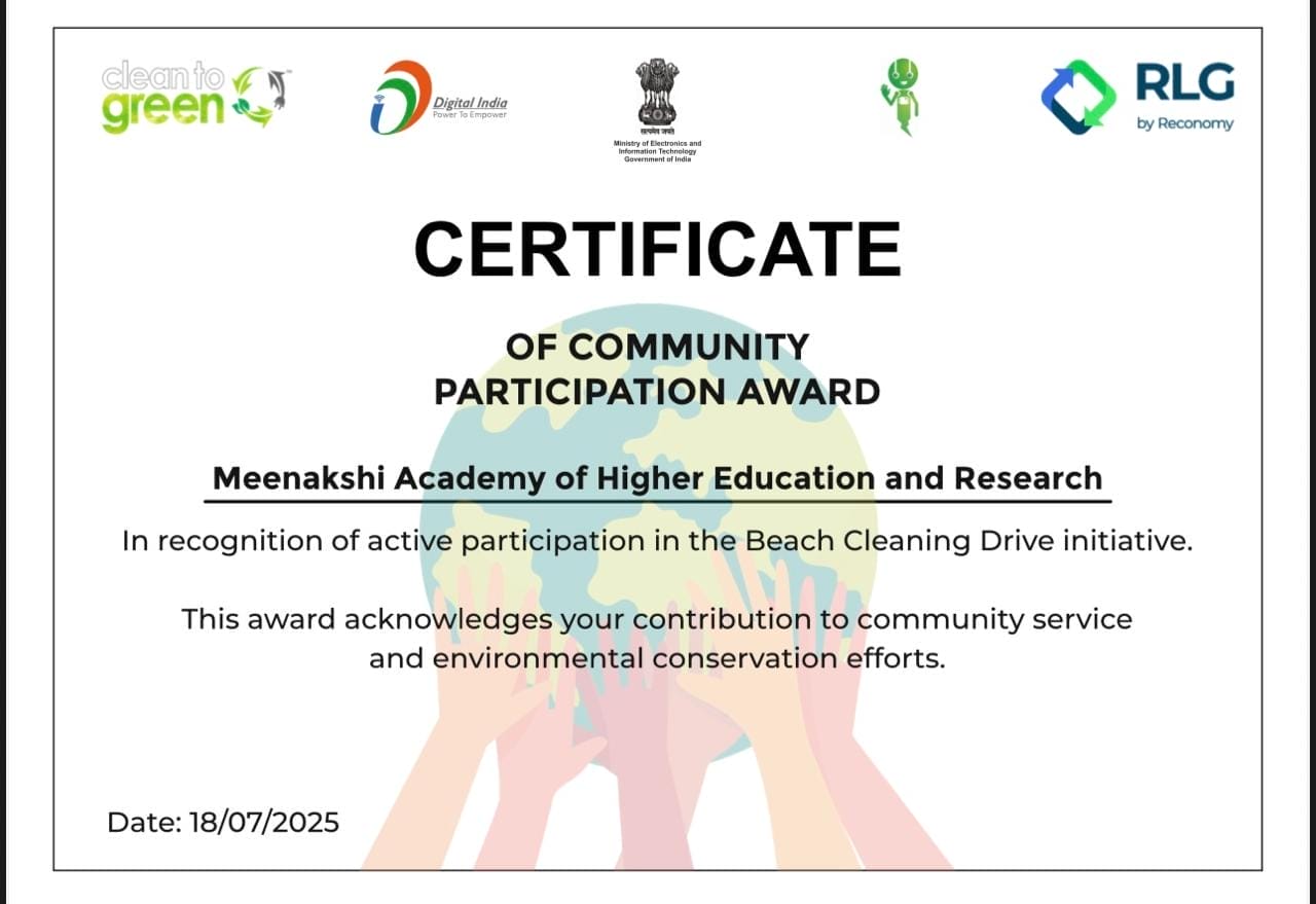 As part of its ongoing commitment to environmental sustainability and civic responsibility, the NSS Units of MAHER organized a Beach Cleaning Drive on 17th July 2025 at Besant Nagar Beach, Chennai. The event, held in collaboration with the Clean to Green Organization and the Corporation of India, took place between 6:30 AM and 8:30 AM, aiming to raise awareness about the importance of keeping public spaces clean and preserving natural environments.
