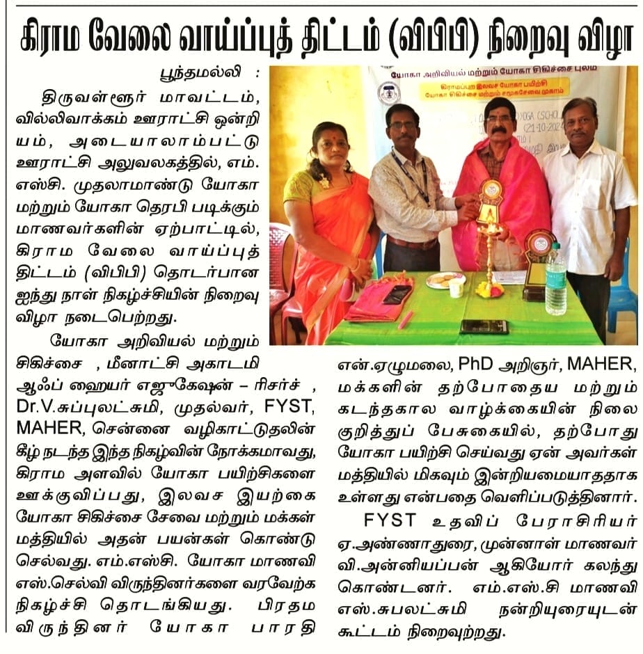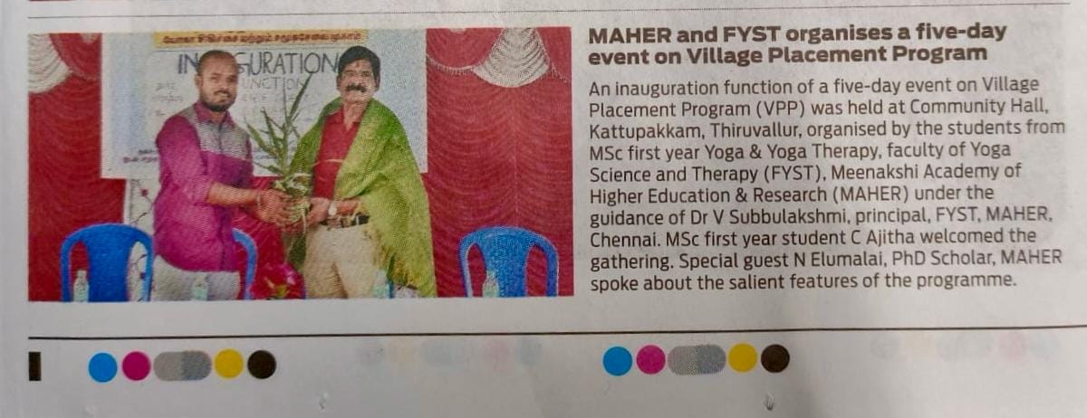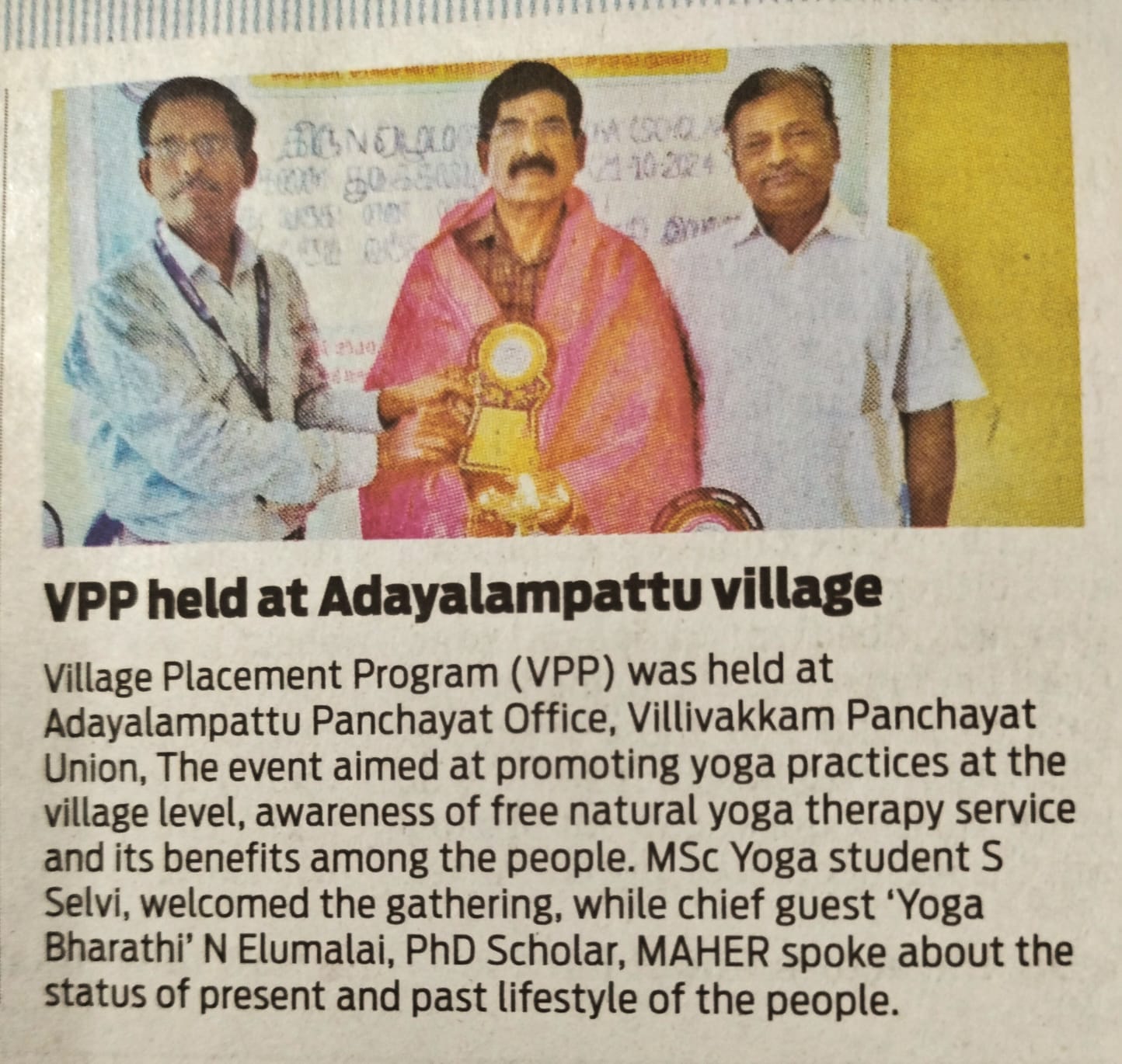 | 06-11-2023 to 10-11-2023 | Community Health Education program (Village Placement Program-Kattupakkam) | Faculty of Yoga Science and Therapy | |