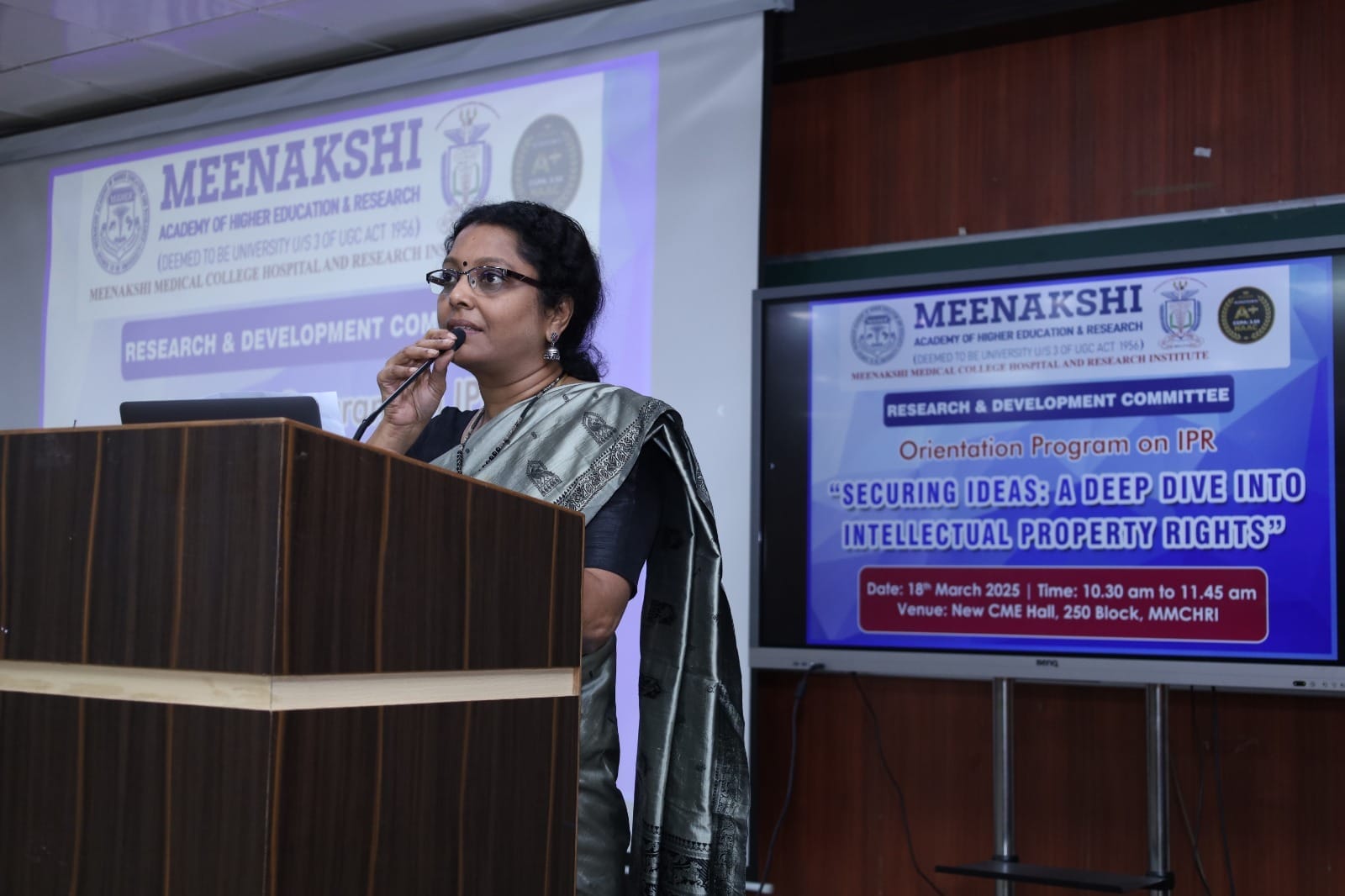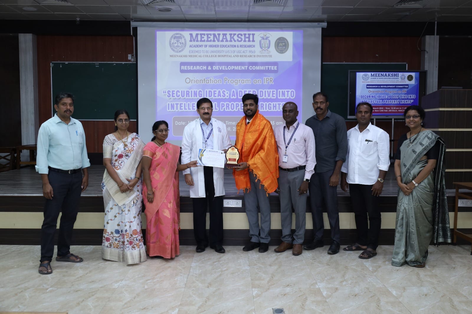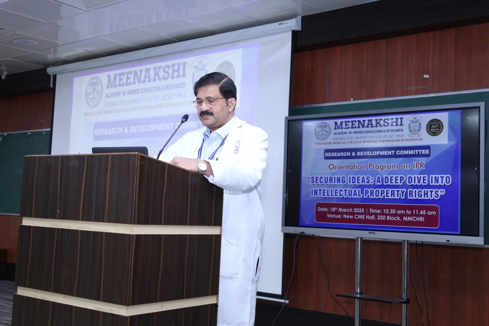 The Research & Development Committee of Meenakshi Medical College Hospital and Research Institute organized a one-day orientation program on Intellectual Property Rights (IPR) for undergraduate students on 18th March , 2025. The program, titled “Securing Ideas: A Deep Dive into Intellectual Property Rights,” aimed to provide students with a comprehensive understanding of IPR. The program commenced with an inauguration, followed by an introduction to Intellectual Property Rights: Understanding the Basics, by Dr. N. Muninathan, CRL Scientist, MMCHRI. A session on Copyrights and Trademarks: Protecting Creative Works and Brand Identity was conducted by Dr. Ponmurugan Panneer Selvam, Dean of Doctoral Studies, MAHER University. Dr. Sooriaprakas Chandrasekaran, Associate Professor, Department of Conservative Dentistry and Endodontics, Meenakshi Ammal Dental College and Hospital, delivered a lecture on IPR in the Medical Field, followed by a session on Patents: The Backbone of Technological and Pharmaceutical Innovation by Dr. Saravana Kumar S., IPR Coordinator, R&D Committee, MMCHRI. The program concluded with a session on Ethics and IPR by Dr. Punitha V. C., Associate Professor of Community Medicine and Research Coordinator, R&D Committee.