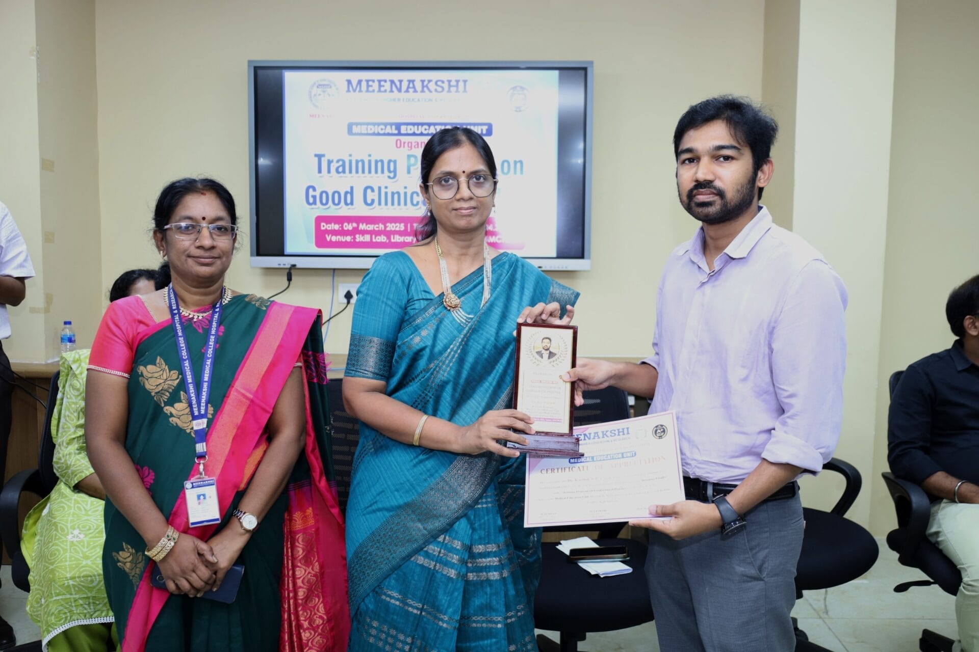 The Medical Education Unit (MEU) of Meenakshi Medical College Hospital & Research Institute (MMCH&RI) organized a one-day training program on Good Clinical Practice (GCP) on March 6, 2025. The programme aimed to educate participants on the ethical and scientific principles of GCP, its importance in clinical research, and the regulatory requirements for conducting clinical trials. The program commenced with an insightful introduction to GCP and its significance in clinical research, presented by Dr. Parimala K., HOD of Pharmacology at MMCHRI. Subsequently, Dr. Karthick V. P., Associate Professor of Pharmacology at SRMC, led engaging sessions on ethical principles in clinical research and clinical trial design. Dr. Rajesh R., Professor of Dermatology at MMCHRI, provided an in-depth overview of the roles and responsibilities involved in clinical trials. The post-lunch session featured a lecture on informed consent process by Dr. Shankar K., HOD of Community Medicine at MMCHRI, ensuring participants understood its critical role in research. Dr. Pachamuthu Balakrishnan, Professor & Chief Scientist of Infectious Diseases, MAHER, covered essential topics such as documentation, safety reporting, and adverse events, highlighting the importance of thorough record-keeping in clinical trials. The program concluded with a comprehensive session by Dr. Punitha V. C., Research Coordinator, MMCHRI, who discussed the role of regulatory bodies and the consequences of GCP non-compliance.