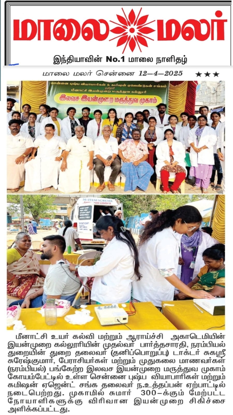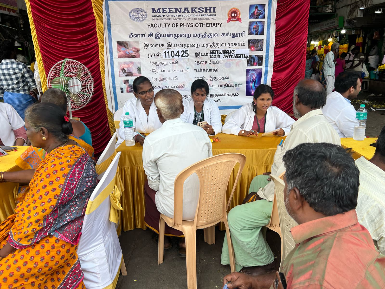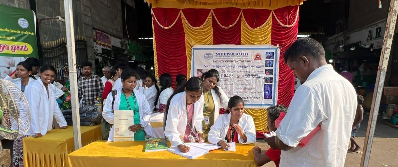 The Faculty of Physiotherapy, Meenakshi Academy of Higher Education and Research (MAHER), conducted a successful community physiotherapy camp on Friday, April 11, 2025, at the Koyambedu Flower Market, Chennai. Organized in collaboration with the Chennai Flower Retail Market Association, the camp aimed to offer essential physiotherapy services and raise awareness on health and preventive care.