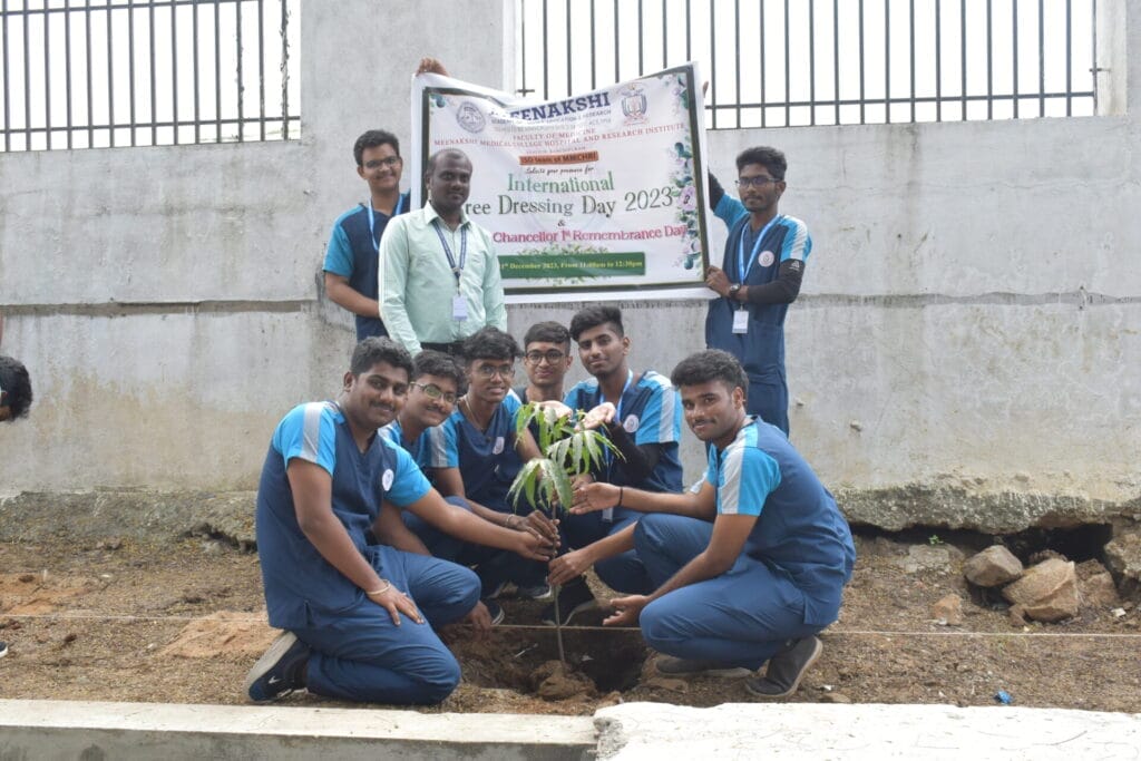The ISO Team of Meenakshi Medical College Hospital and Research Institute, Kanchipuram conducted Planting Tree Saplings Event on International Tree Dressing Day and occasion of Founder Chancellor 1st Remembrance Day on 11/12/2023. Around 80 faculties and 170 students participated. Tree Saplings provided by the Forest Department in the honor of Founder Chancellor were planted by faculties and students.