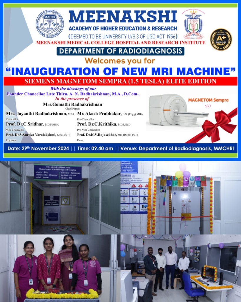 Department of Radiodiagnosis, Meenakshi Medical College Hospital and Research Institute conducted the Opening Ceremony of New MRI Machine (SIEMENS MAGNETOM SEMPRA(1.5TESLA) ELITE EDITION). Vice Chancellor, Prof. Dr. Sridhar, MD,FIMSA and Pro-Vice Chancellor, Prof. Dr. C. Krithika, MDS, Ph.D highlighted this event.