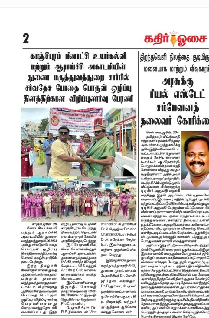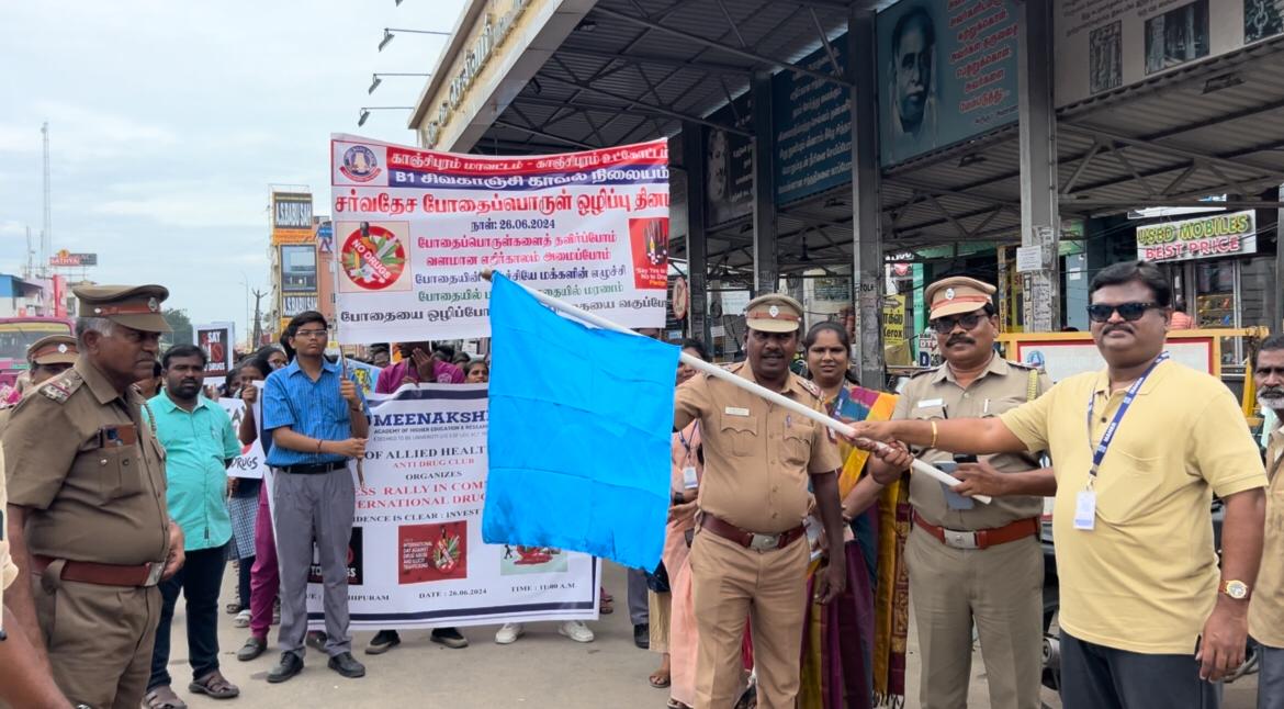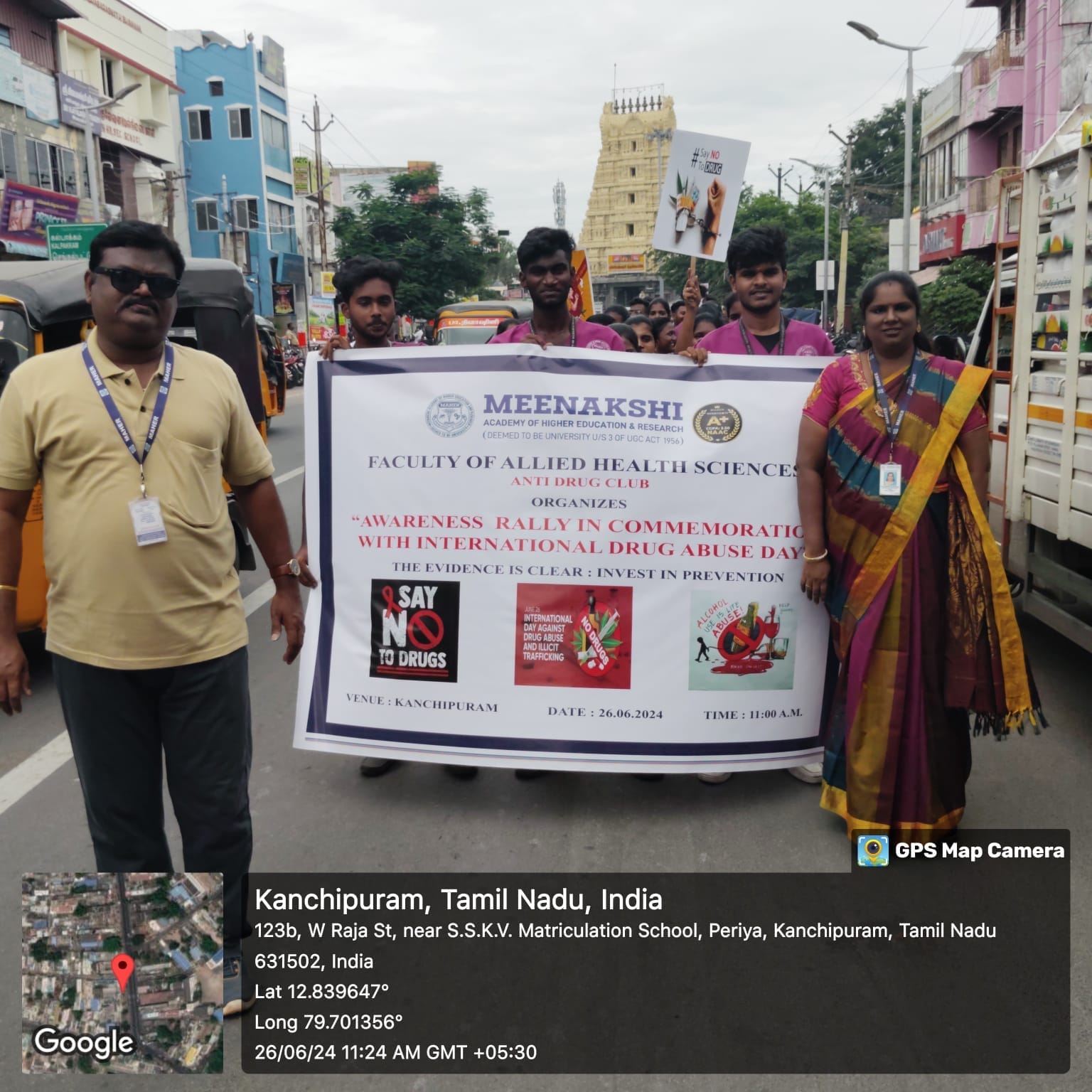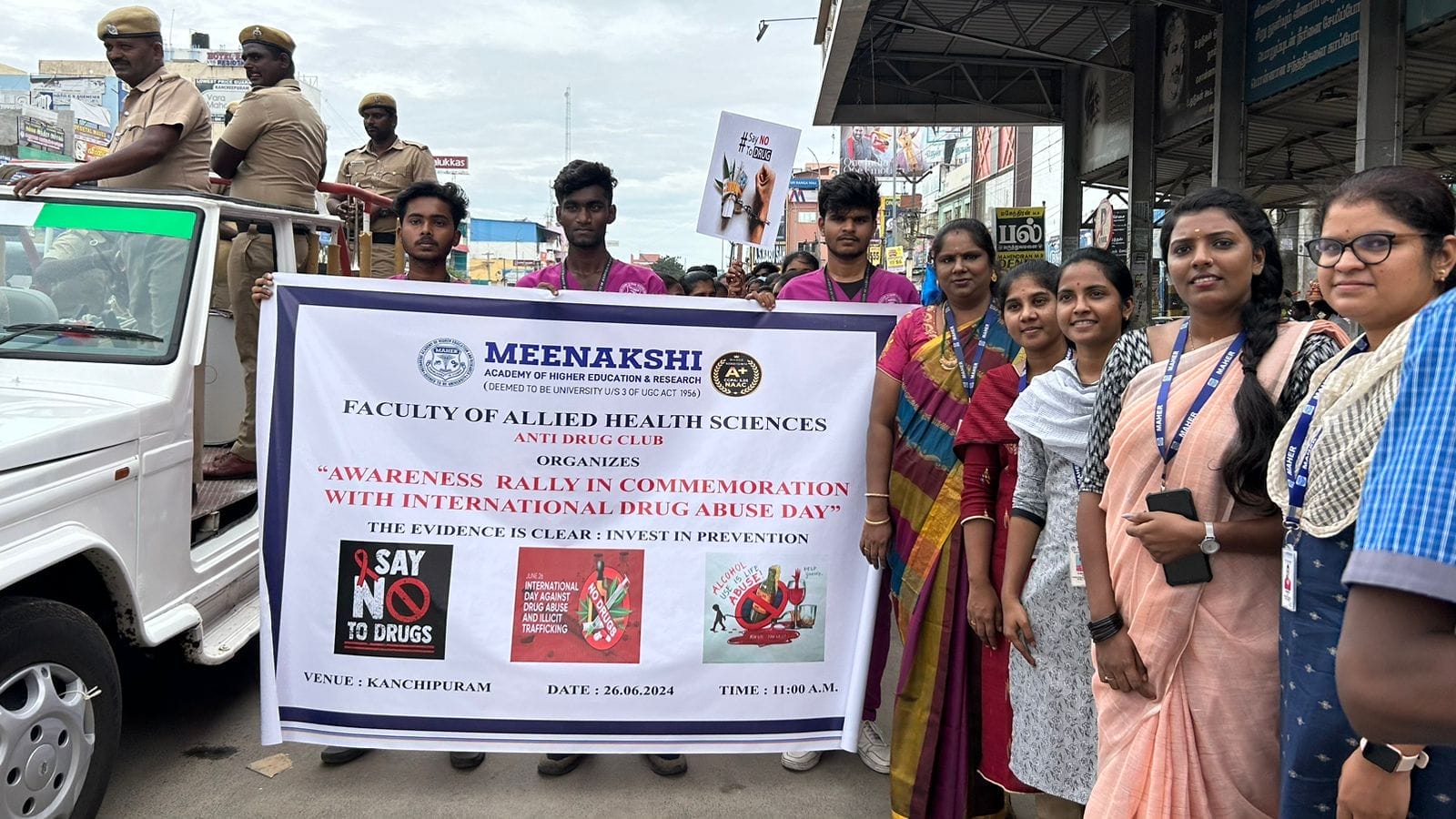 On June 26, 2024, the Faculty of Allied Health Sciences, MAHER organized a significant rally in observance of the International Day Against Drug Abuse and Illicit Trafficking. The event commenced with a flag-off ceremony led by FAHS Principal Prof. V. Ramnath and Siva Kanchi Sub-inspector Mr. Annadurai at Kancheepuram bus stand. From there, approximately 100 FAHS students from the NSS (National Service Scheme) and Antidrug club actively participated in the rally.
