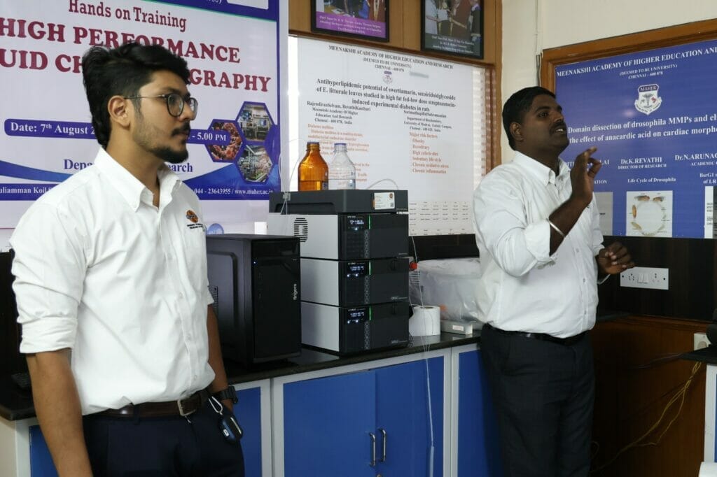 Department of Research, MAHER organized an Hands-on Training Program on High Performance Liquid Chromatography (HPLC) on 7th August 2023. The event aimed to provide participants with a comprehensive understanding of HPLC techniques, applications, and hands-on experience in operating HPLC . The workshop was led by experts: Mr.Bharathiraja and Mr.Mohamed Nabiel from Spinco Biotech Pvt., Ltd., which is a renowned Biotech company in the field of chromatography. 20 participants attended the session.