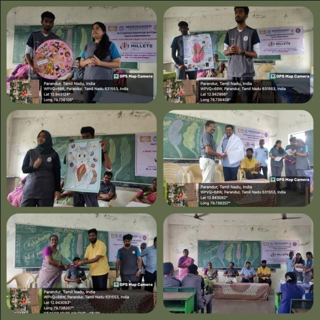 Under the Auspicious guidance of Meenakshi Academy of Higher Education and Research, on the occasion of International year of millets 2023, Debate competition was conducted for the School Students in Government High school of Parandhur village on 03.11.2023 by the Department of Community Medicine, Unnat Bharat Abhiyan, and National Service Scheme. Under the guidance of Dean Dr. Rajasekhar, Dr. Shankar (Professor and HOD), Dr.Pandiyan K.R (Associate Professor & UBA Co-coordinator) and under the supervision of Dr. Sakthivel (Senior Resident) the program was organized by faculties and postgraduates of Department of Community Medicine. The Headmaster of the Parandhur Government High school graced the occasion. There were about 60 students.
