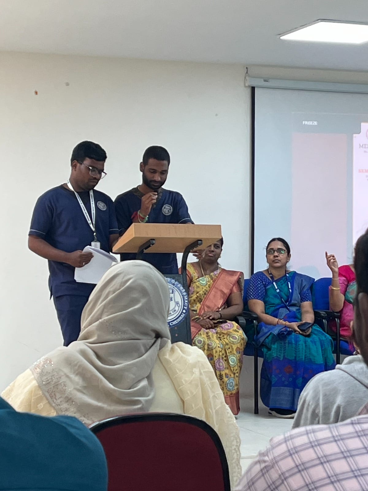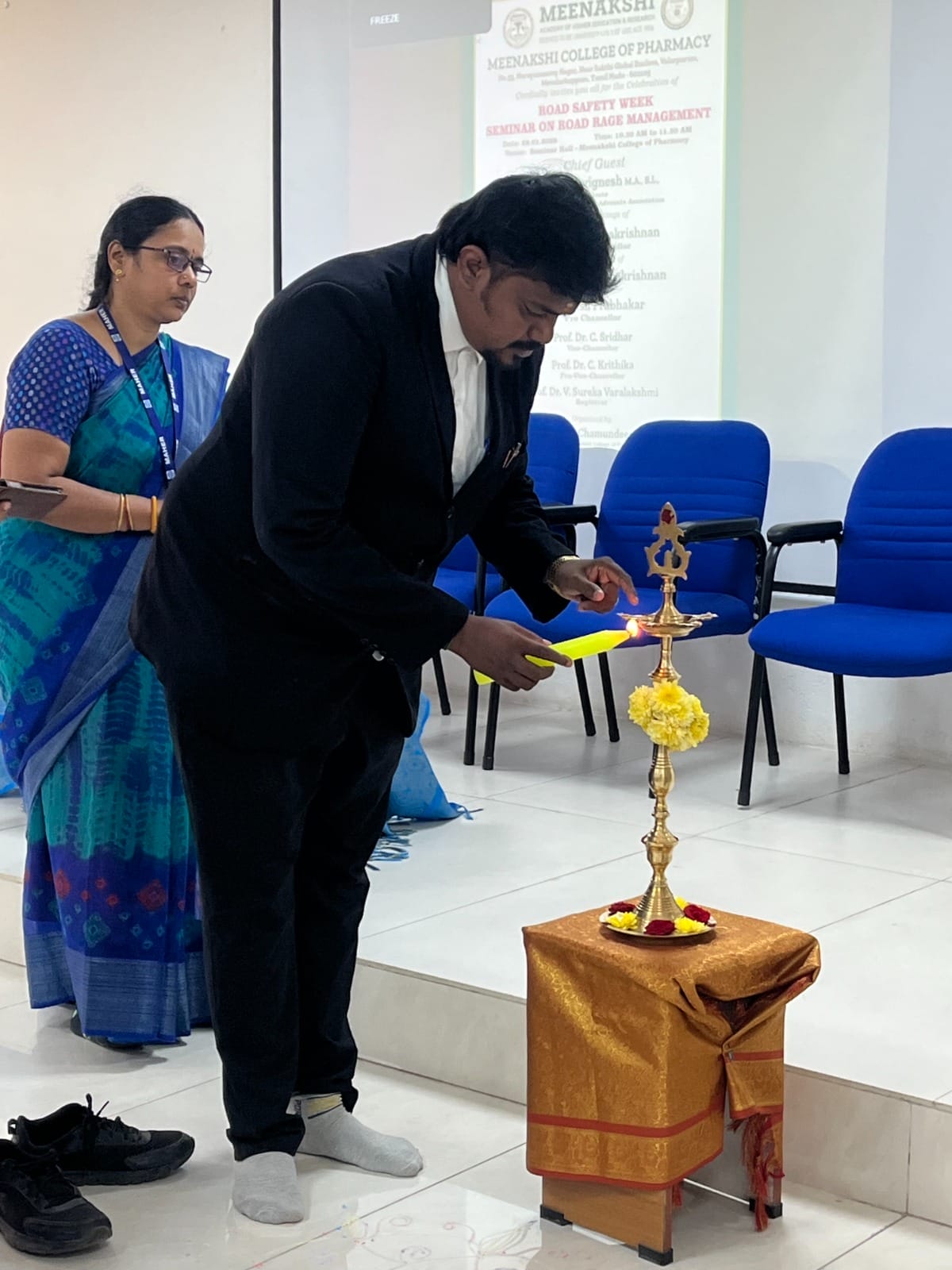 The seminar commenced with the traditional lighting of the Kuthu Vilakku by the esteemed Chief Guest, Mr. Rajavignesh, MA, BL, Advocate and Vice President, Alandur Advocate Association. The welcome address was delivered by Prof. Dr. D. Chamundeeswari, who highlighted the significance of Road Safety Week and formally introduced the Chief Guest. This was followed by a brief introduction to the seminar theme and the resource person by Prof. K. K. Rajasekhar, Head, Department of Pharmaceutical Chemistry.