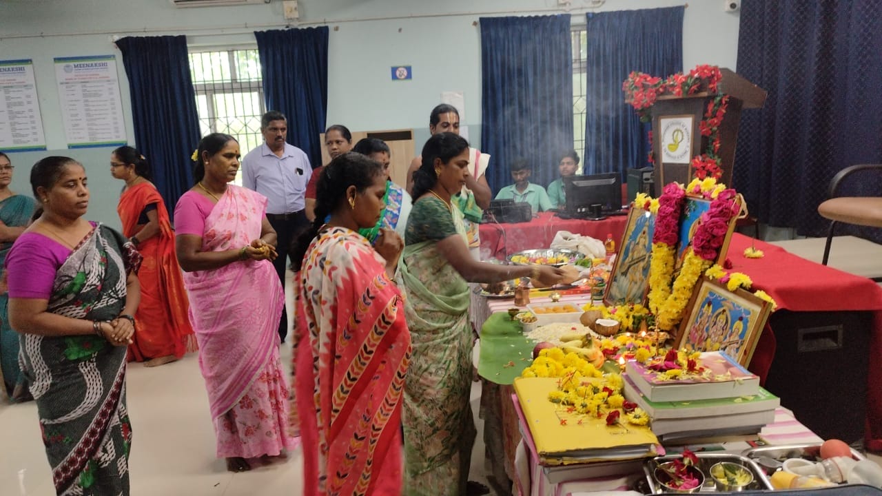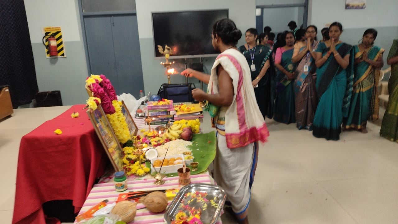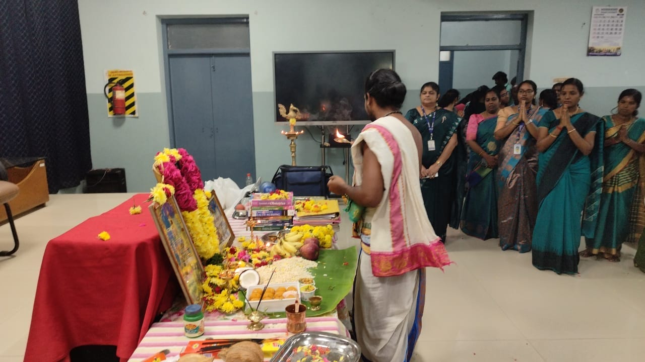 The celebration was graced by the presence of Principal Dr. Fabiola M. Dhanaraj, Vice Principal Dr. Jayabharathi B, along with faculty, staff, and students, who collectively worshipped Goddess Saraswati, honoring knowledge, art, and music. The College was adorned with mavilai thoranam made of mango leaves and marigolds, radiating festivity and devotion. The event commenced with the lighting of the kuthuvilakku by the dignitaries, followed by ceremonial rituals accompanied by the chanting of sacred slokas by a learned Iyer. The fragrance of flowers and the aroma of burning camphor added to the serene and spiritual ambience.